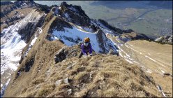 Bis auf wenige Stellen top Verhältnisse, mehrheitlich aper. Auf dem Grat gibt es - von unten nicht sichtbar - aber immer wieder ein paar (meist sehr ausgesetzte!) Meter mit hartem, rutschigen Schnee auf Eisunterlage. Steigeisen nicht notwendig, eher dann halt mal im Reitlingssitz über den Grat... Auch das Steilgras ist entsprechend rutschig, meist aber gut gestuft, so dass auf den Pickeleinsatz verzichtet werden kann.