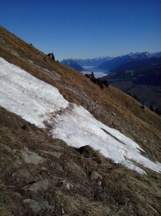 Ganze Route trocken, nur an zwei kurzen Stellen in der Querung unten am Gipfelhang (siehe Fotos) etwas Schnee/Eis. Hier ist Vorsicht geboten, es hat aber gute Tritte. Stöcke angenehm. Statt Schneekristallen glänzen hier jetzt die Silberdisteln im Sonnenschein.