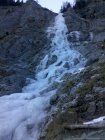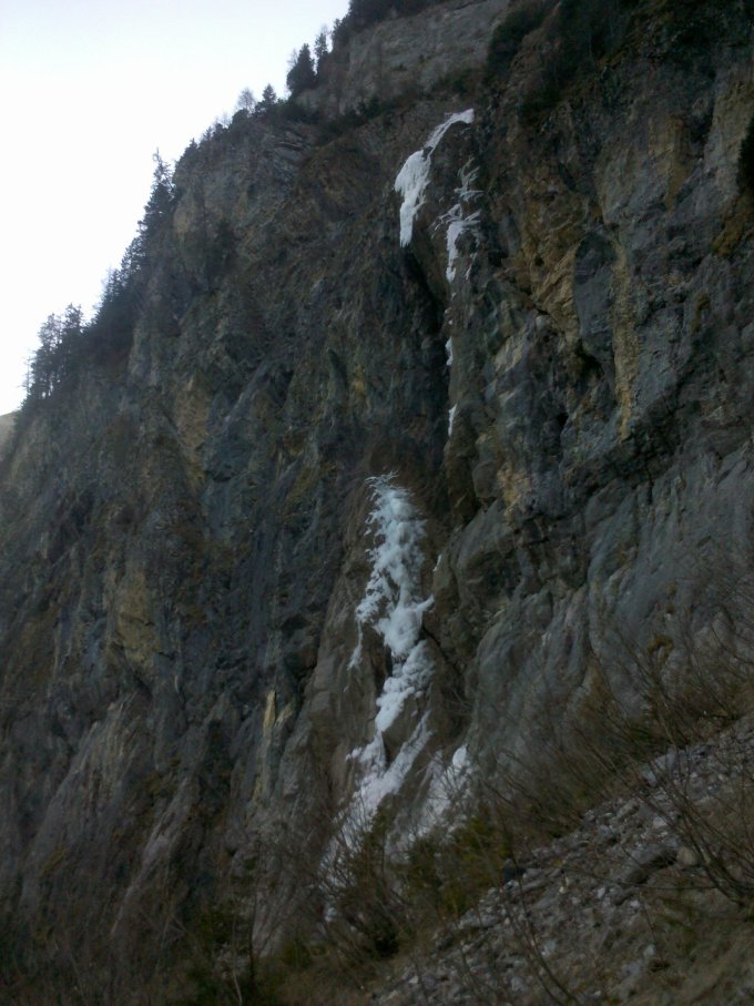 Fall im oberen Teil gut gebildet: unten am Einstieg splittrig hartes Eis und sehr flach, oben dann schönes Softeis und sehr schön zu klettern. Beim Abseilen am Baum aufpassen, dass man genügend weit links (vor dem Fall stehend, in Kletterrichtung) abseilt. Jetzt ist eine zusätzliche Sanduhr drin.