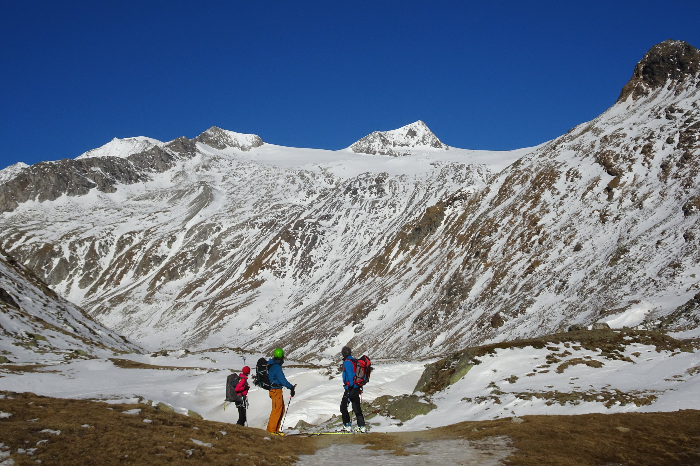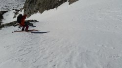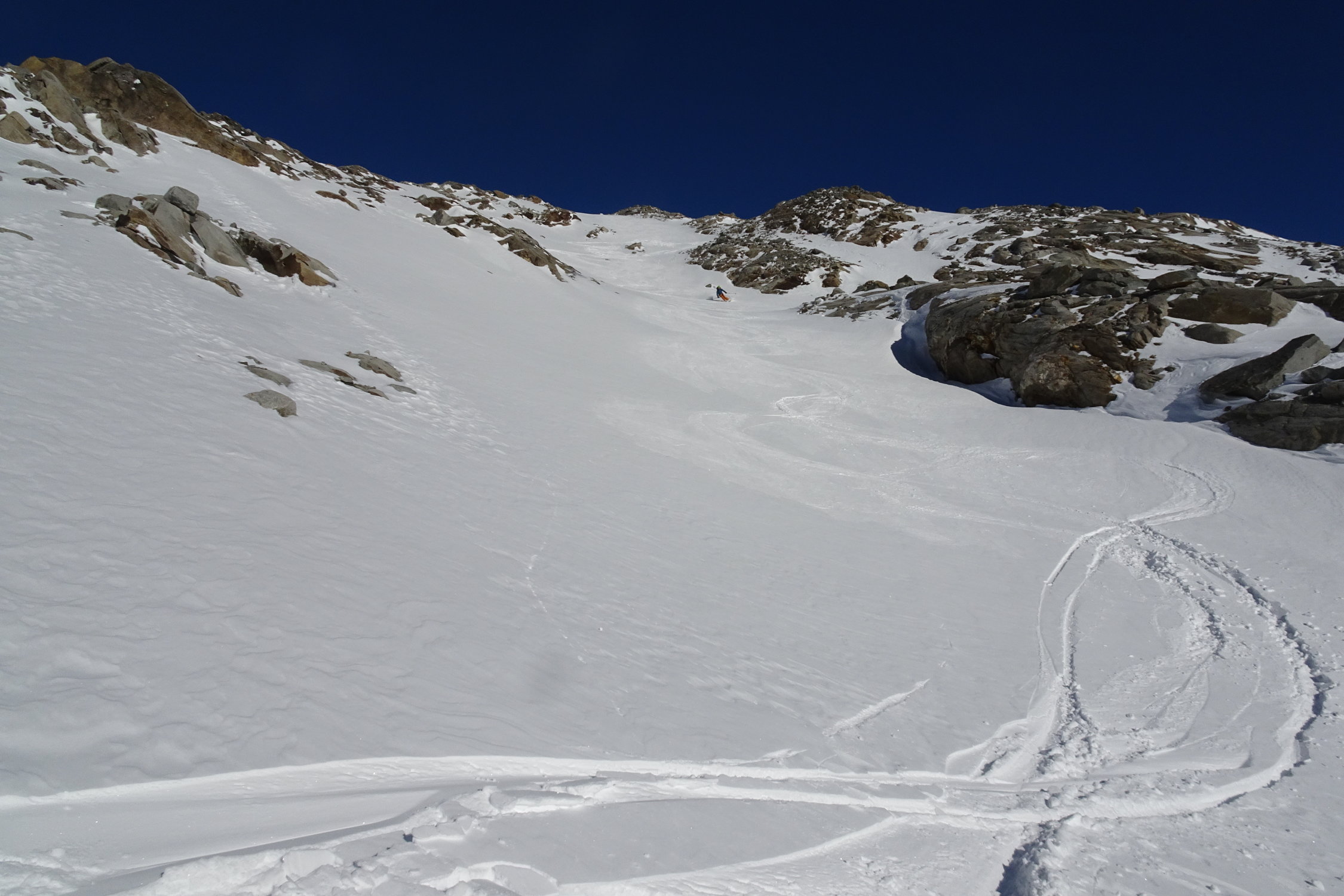 Abfahrt: am Gletscher im oberen Bereich wie üblich die Windgangeln, sonst sehr gute Verhältnisse. Abfahren bis zum Gumbachkreuz in einer Höhe von 1885m