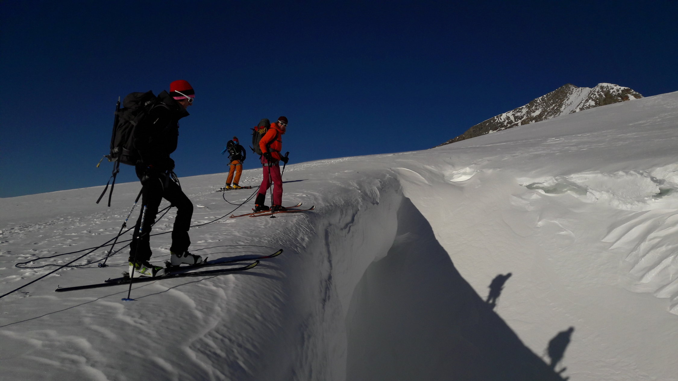 Offene Spalten sehr gut sichtbar, natürlich trotzdem umsichtig fahren, die Sichtweise verändert sich ja beim Auf/Abstieg.