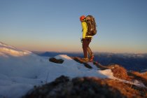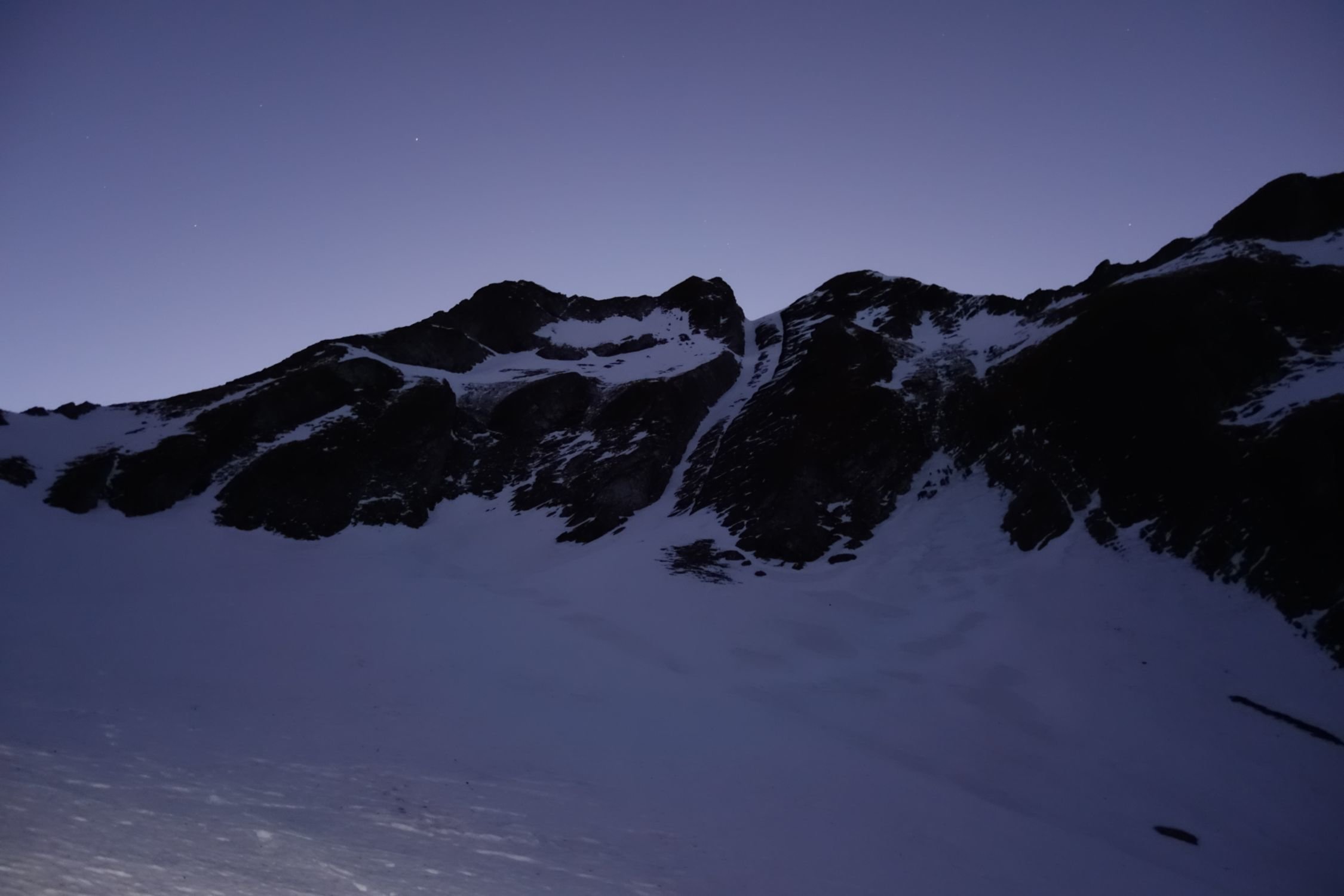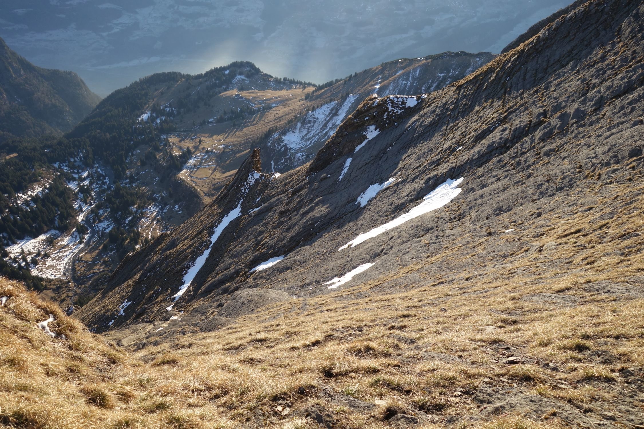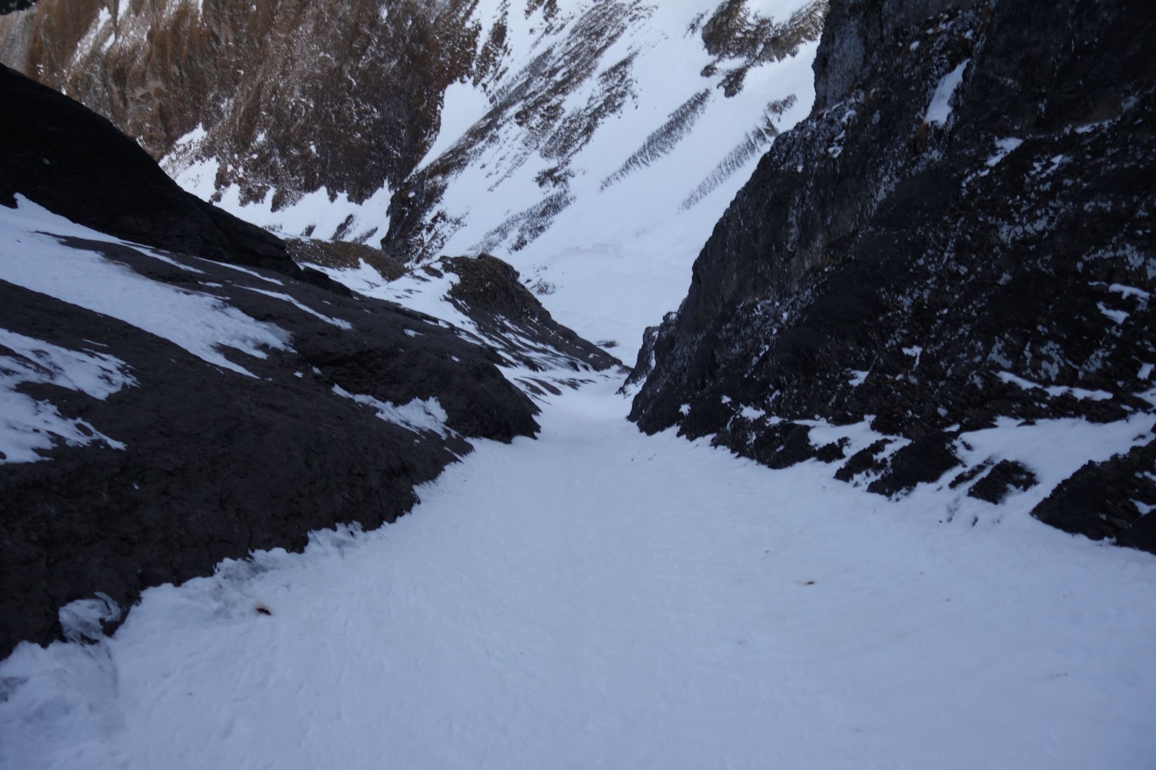 Am nordseitigen Grat sind Steigeisen zwingend. Der Abstieg war zum Glück ein Kinderspiel, das Doppelgleis war ein angenehmes Griesschnee-Couloir, stellenweise harter Schnee aber kein Blankeis.