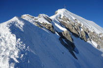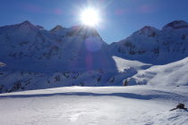 Am Gipfel dann die Entscheidung, auf Grund der Top Verhältnisse auf der Nordseite und den knüppelharten Verhältnissen auf der Südseite, die Abfahrt durch die Nordwestflanke zu wagen. Die ersten Meter war der Untergrund noch hart aber griffig, dann aber Traumpulver in der ganzen Flanke. Total genial. Solche Verhältnisse muss man einfach ausnutzen!