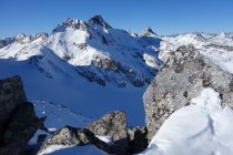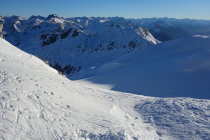 Nach der zweiten Abfahrt querte ich dann hoch zum Hüenersattel. Dort vesperte ich und genoss in der Sonne den Ausblick über die tolle Winterlandschaft. Danach wurde nochmals weiter gequert, bevor es in den unerwartet steilen Anstieg zum Hüenerstock ging. Auch hier ein geniales Panorama.