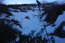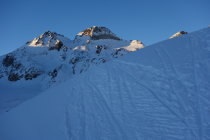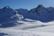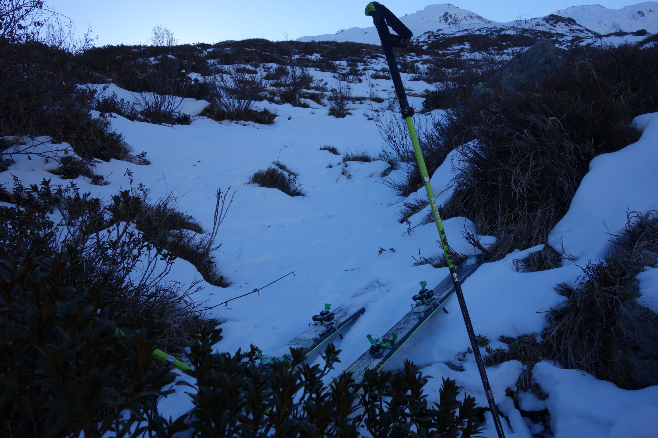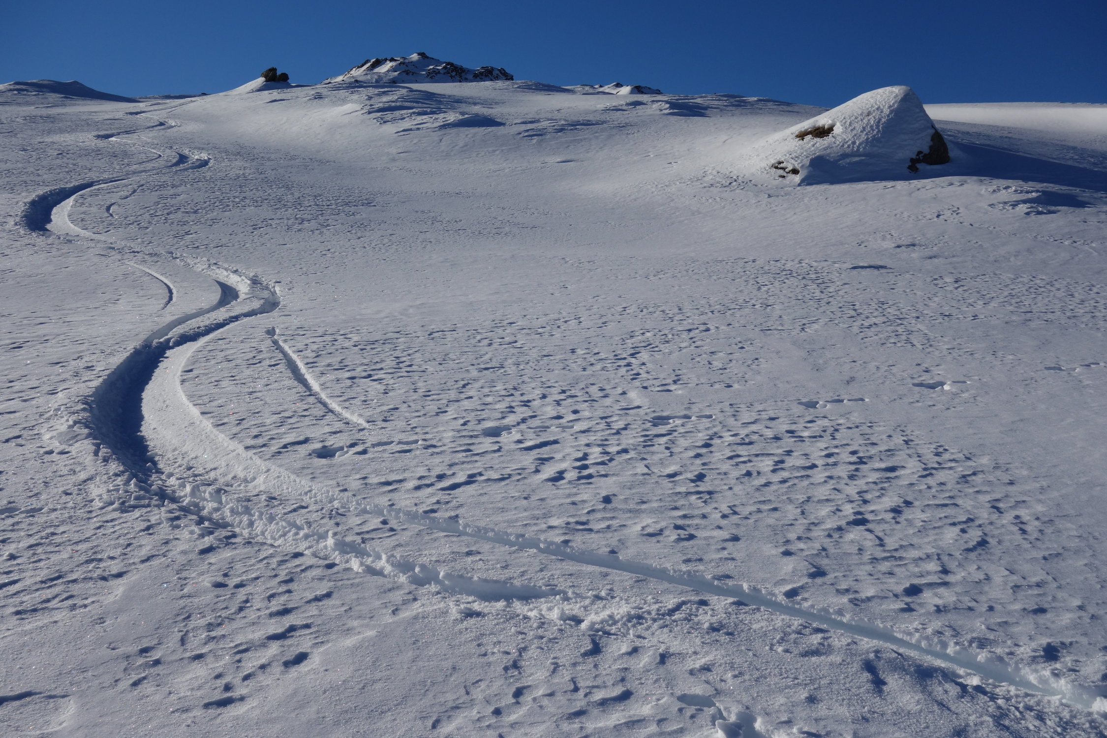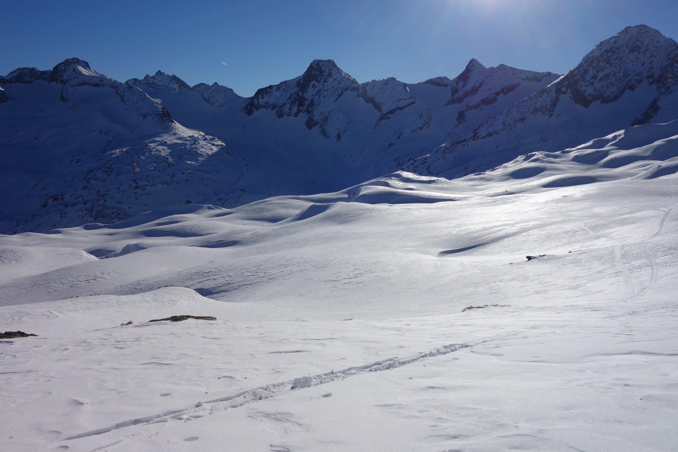 Es folgte eine gemütliche, flache Abfahrt vorbei am Schattigen Firsten. Im Bereich Garschigsee musste noch kräftig mit den Stöcken geschoben werden, bevor ab Gässler 750 tolle Höhenmeter folgten. Ab hier zum Teil wunderschöne Pulverabschnitte.