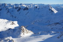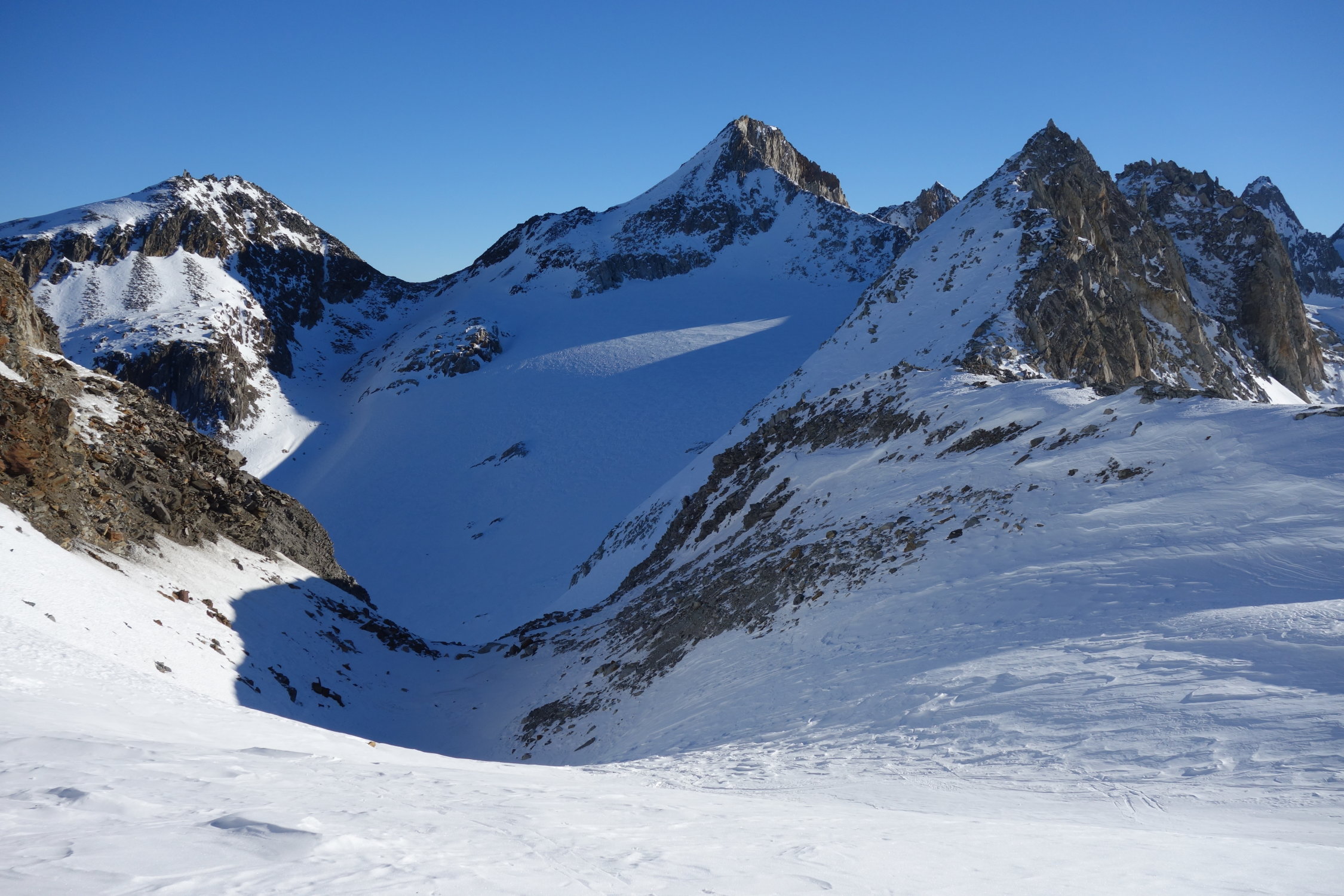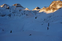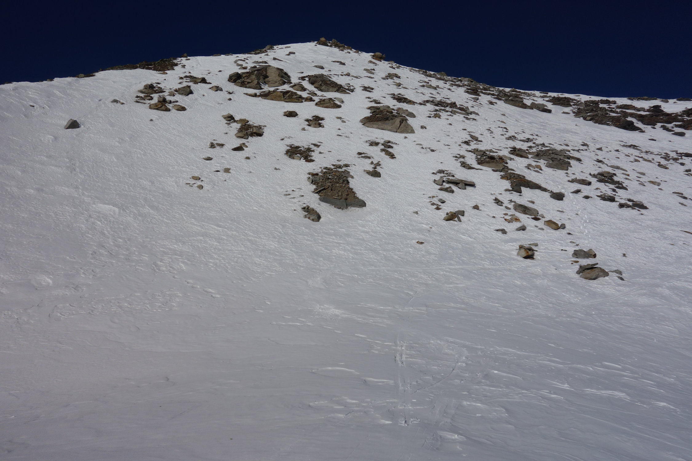 Abstieg zurück zum Skidepot. Auf Grund der noch sehr harten und eisigen Bedingungen in der Südflanke, entschied ich mich dazu die Skier aufzubinden und bis zum Saaspass zu Fuß zu laufen. ...ich glaub das war die richtige Entscheidung. Anschließend knifflige Abfahrt durch diverse Felsblöcke hindurch zurück auf den Muttengletscher. Weiter auf dem Gletscher bis auf etwa 2450m. Dort angefellt und eine kure Rast eingelegt. Den Aufstieg in Richtung Ampelenplanggen empfand ich heikel, da in den Rinnen und schattigen Hängen recht viel Triebschnee war. Es gab auch öfters eindeutige Geräusche und sichtbare Anrisse. Hab mich im Anstieg genau auf dem Geländerücken gehalten was wohl die sicherste Wahl war, aber viele Spitzkehren erforderte. Danach dann genüsslich zurück in Richtung Unter den Stotzigen Firsten. Habe bewusst höher gequert als die Skitourenroute, um später eine längere bzw. steilere Abfahrt genießen zu können. Oben noch eine ausgiebige Mittagsrast und den Blick auf die bezwungen Berge genossen..