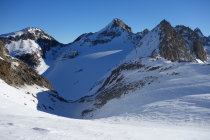 Aufstieg zum Groß Leckihorn auf hartem Untergrund. Harscheisen zwingend. Ab Skidepot gut eingetretene Spur bis zum Gipfel. Wieder geniale Aussicht in alle Richtungen ohne ein Wölkchen am Himmel. Zurück zum Skidepot und kurze Skiabfahrt auf den Muttengletscher.