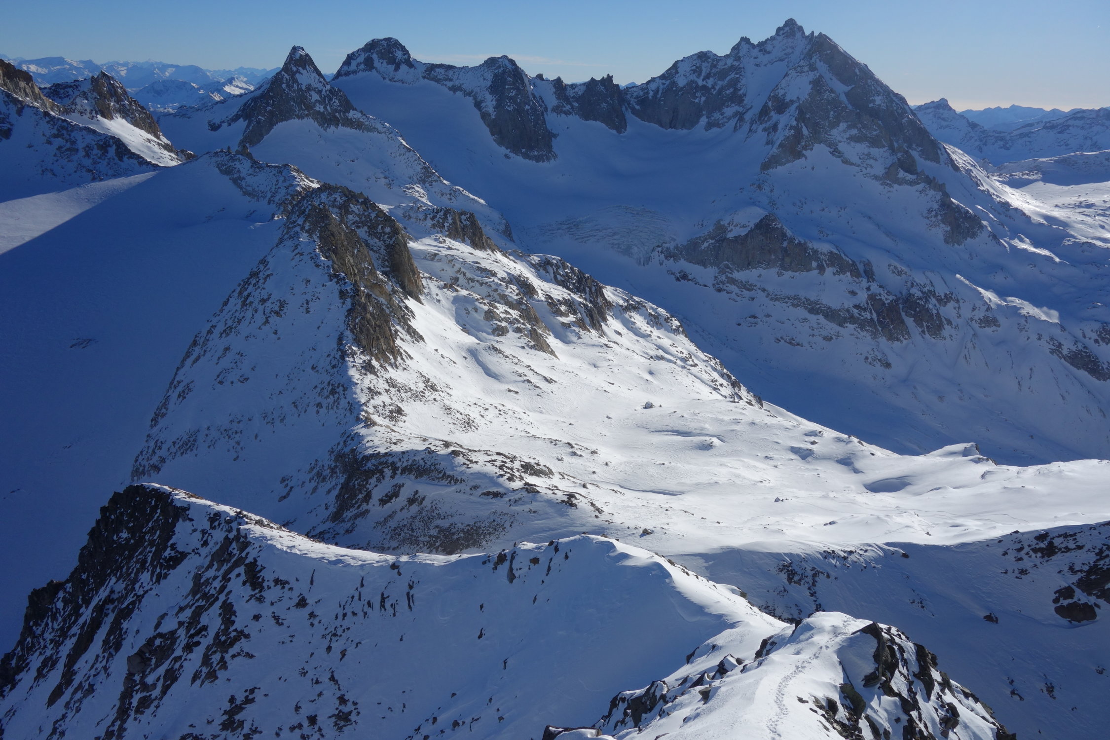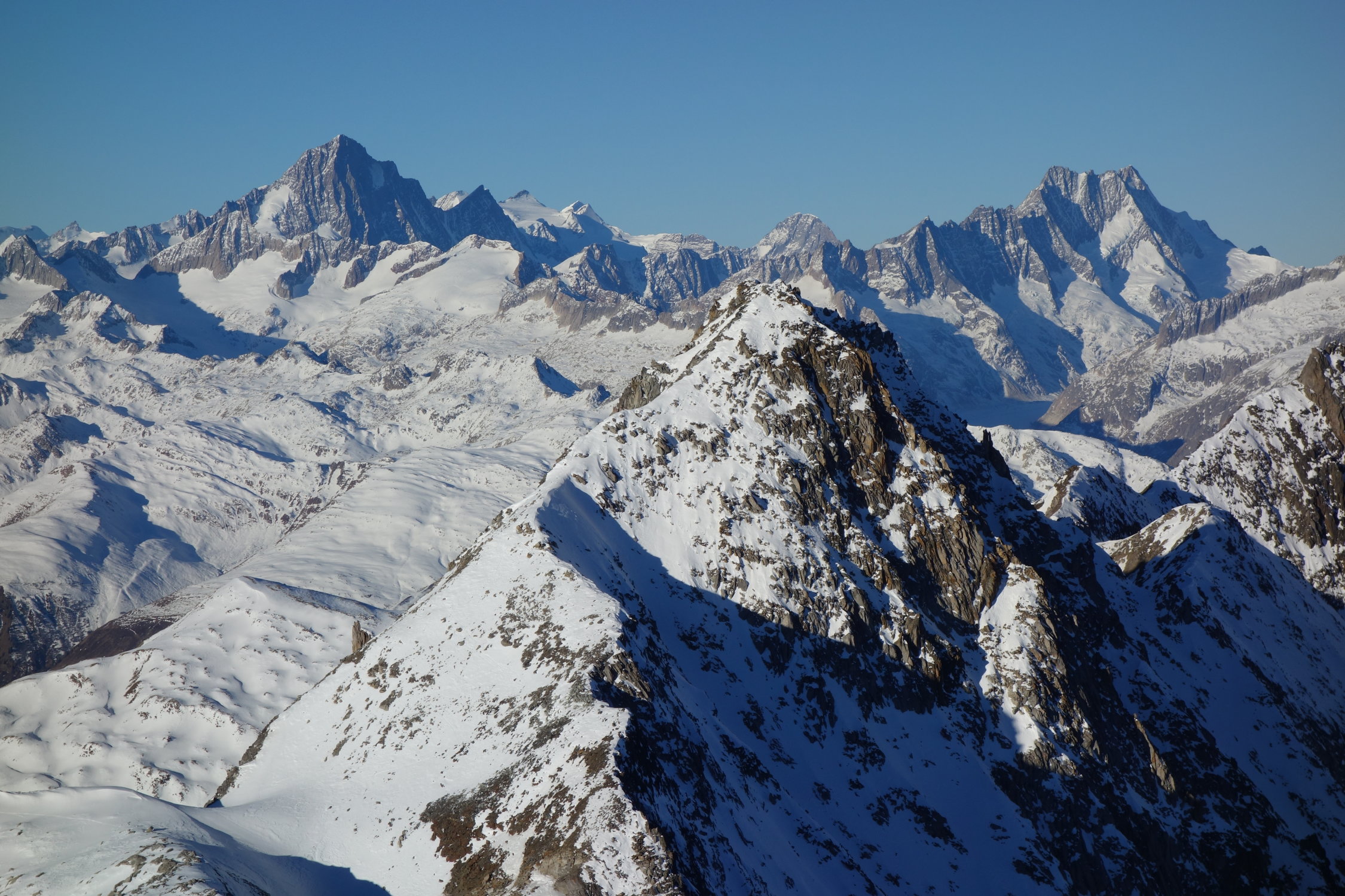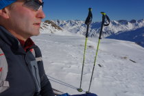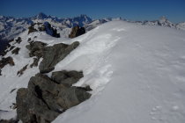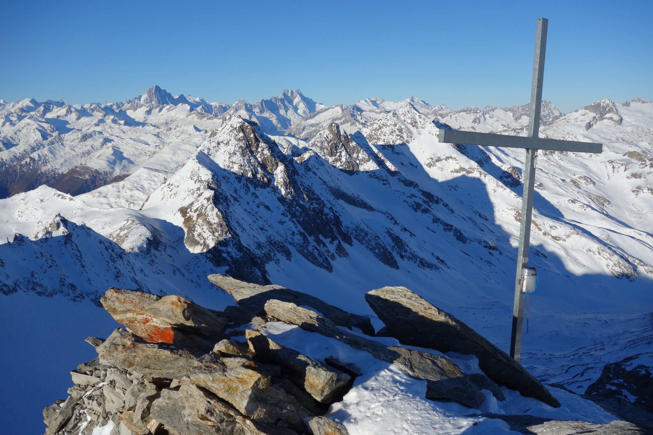 Ein zweites Mal anfellen und recht steil hoch zum Saaspass. Hier ist der Schnee durchwachsen. Pulver, Bruchharsch, hart oder auch eisig. Vom Saaspaß aus entschieden weiter mit Skiern aufzusteigen, da eine alte Aufstiegsspur vorhanden war. Vermutlich wird hier auch oft am Pass Skidepot gemacht. Zum Teil ist das Gehen trotz Harscheisen, gar nicht so einfach in der vereisten steilen Südflanke. Oben am Grat angekommen habe ich dann Skidepot gemacht. Da der Gipfel am Vortag bestiegen wurde, war eine gute Trittspur vorhanden. Ich war trotzdem mit Steigeisen unterwegs, da der Schnee noch hart gefroren war. Es gilt ein paar steilere Aufschwünge zu bezwingen, welche nicht wirklich schwer sind, aber in dem ausgesetzten Gelände durchaus Zutrauen brauchen. Am Gipfel mal wieder eine traumhafte Aussicht :-)