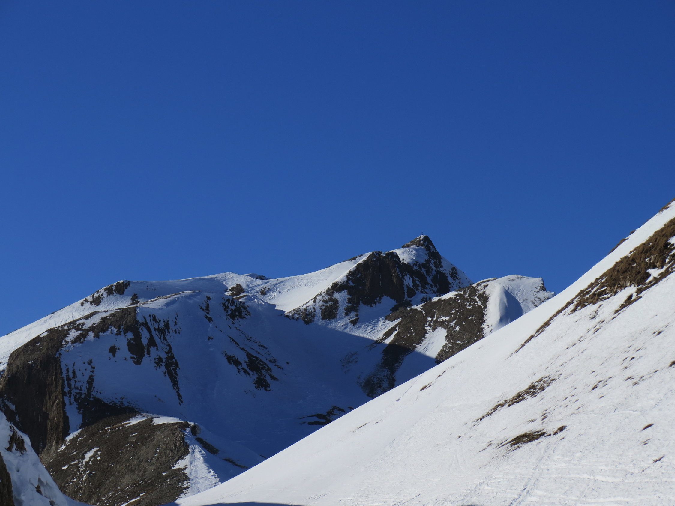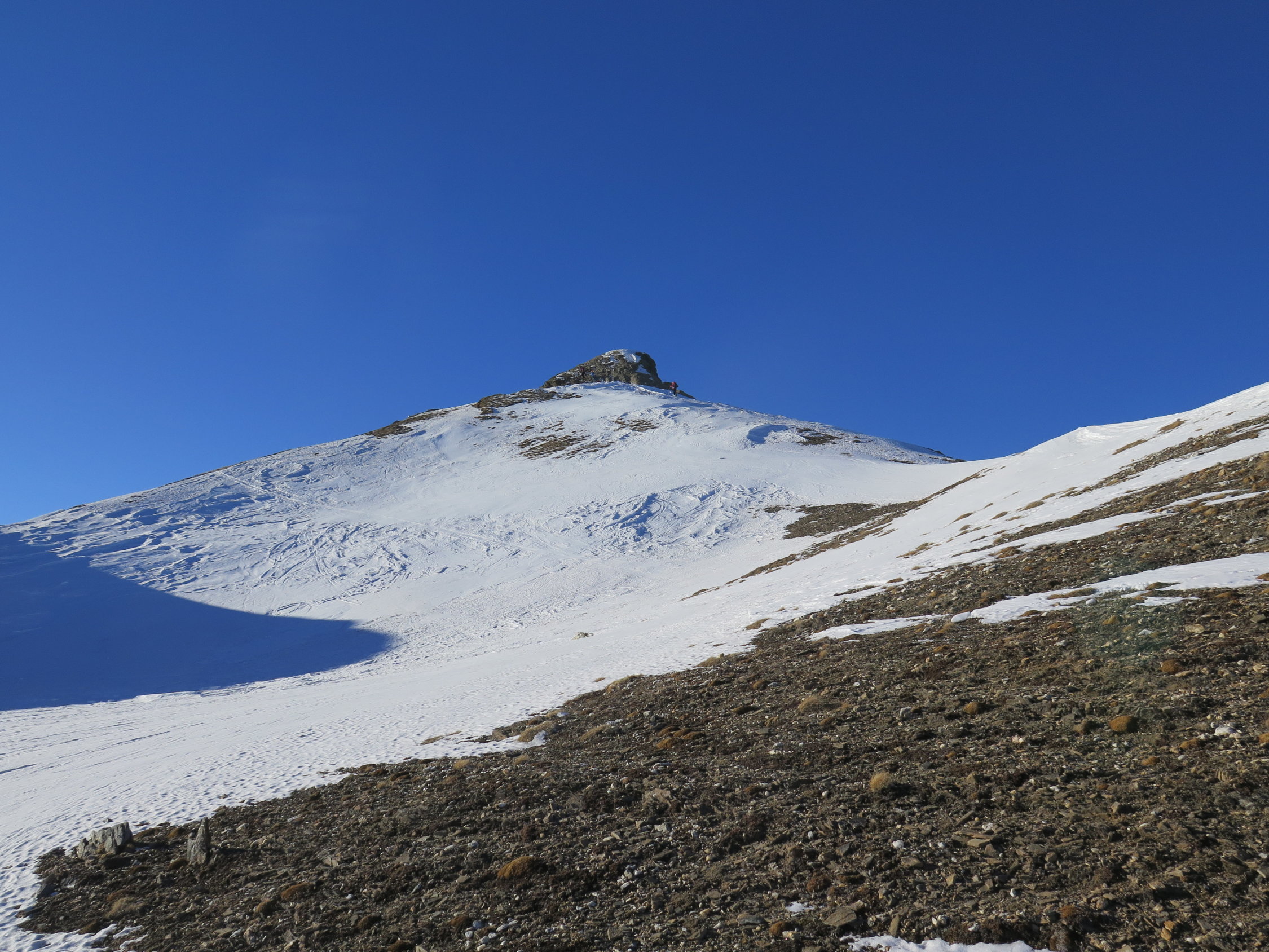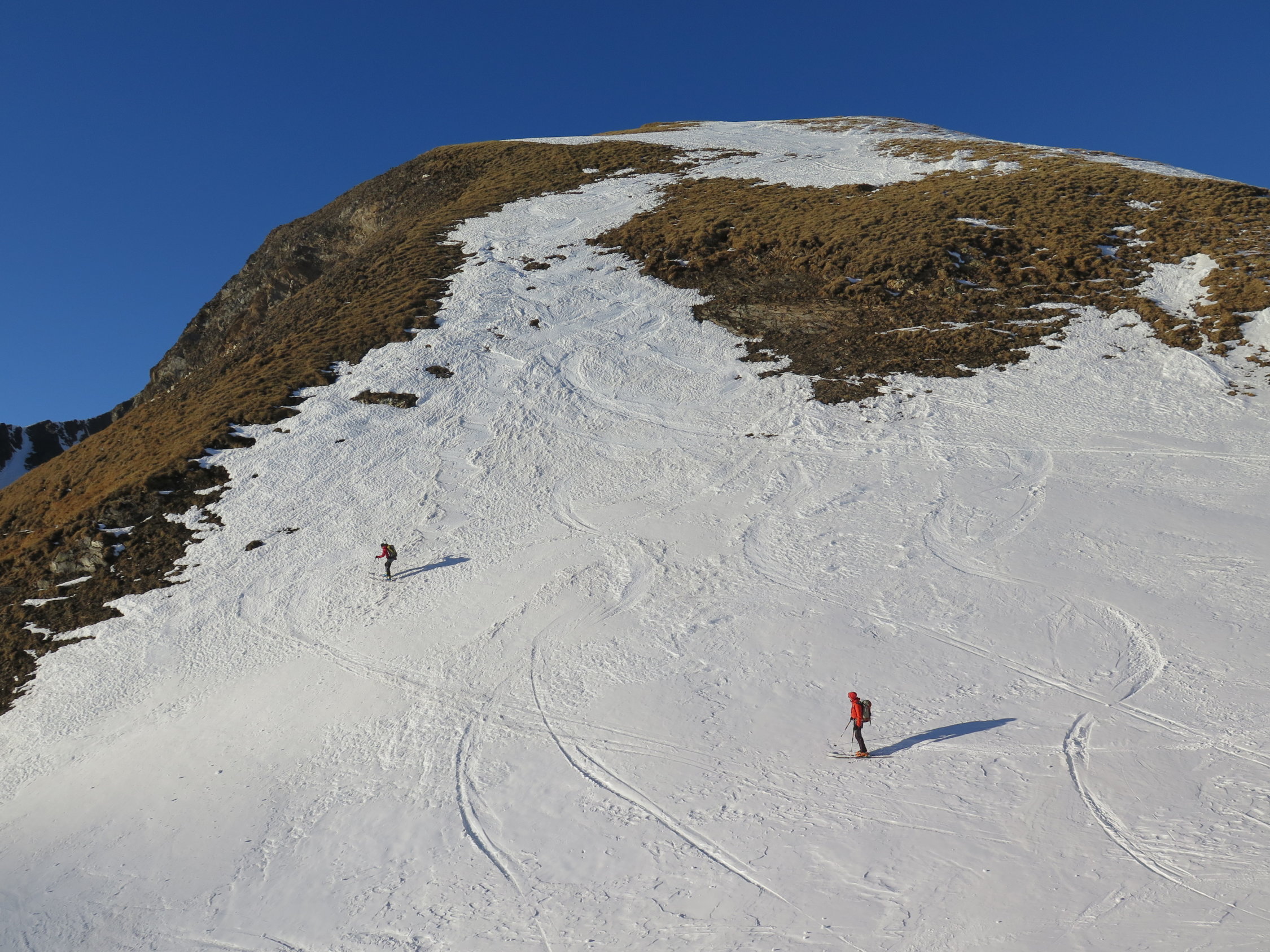 Par contre même à proximité du sommet les faces sud à 45° sont souvent en herbe ou peu de neige.