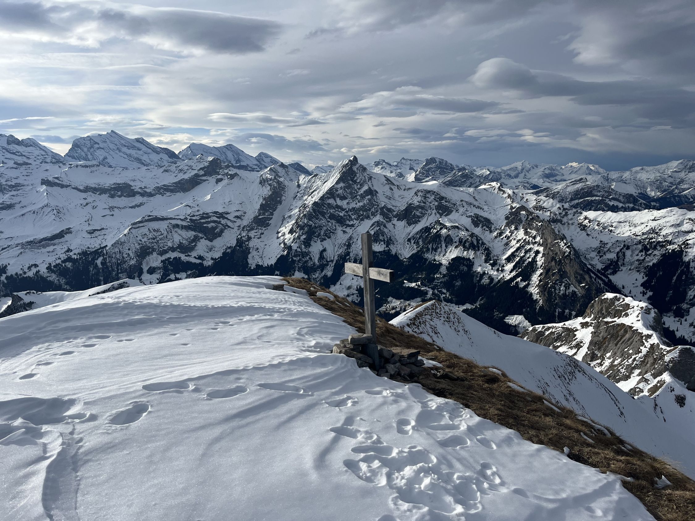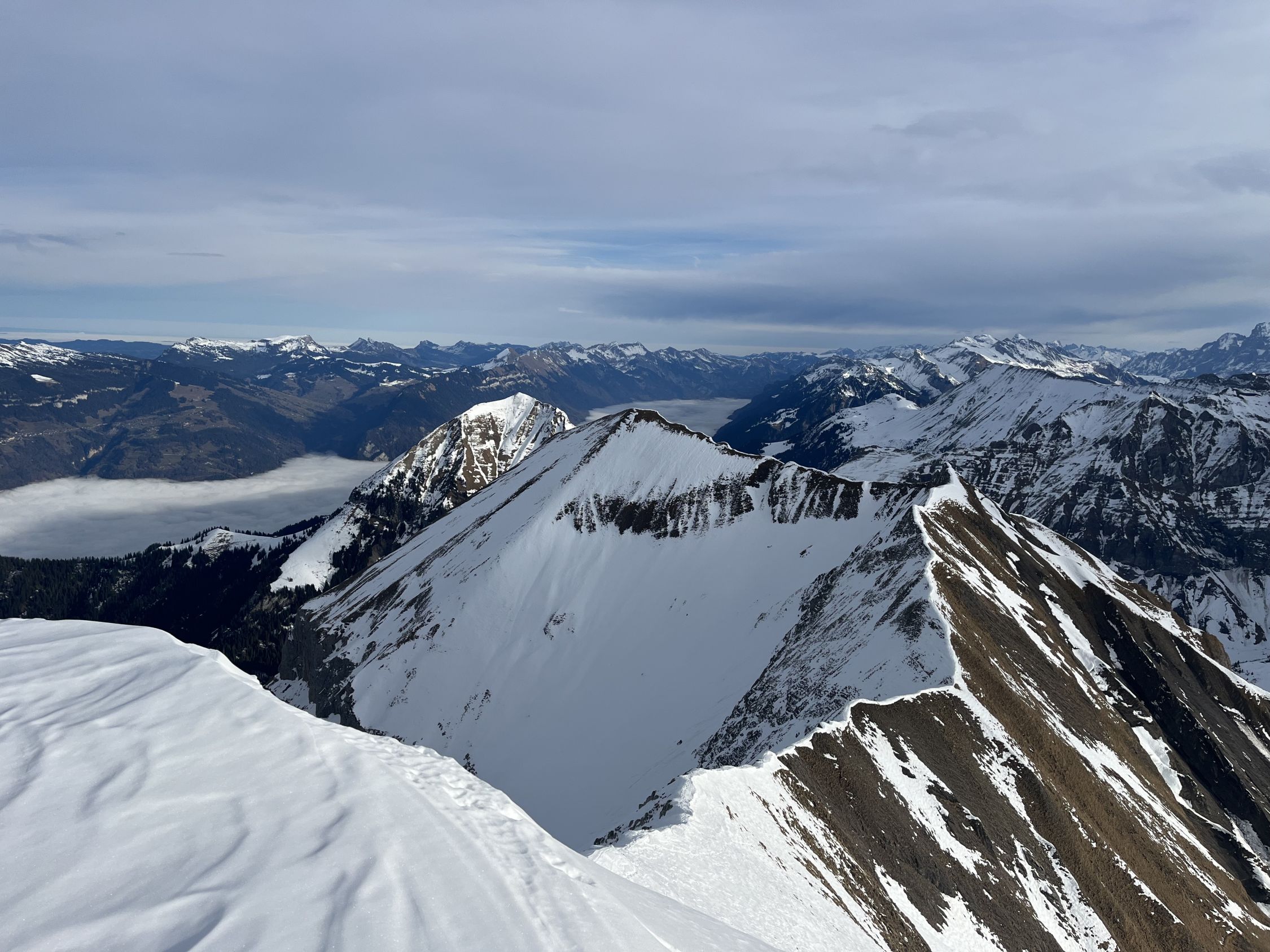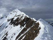 Aufstieg zum Dreispitz über eine neue Variante: Zuerst nach W gegen das Tälchen, dann über eine Rampe zurück nach E ansteigen und durch eine steile Rinne zum Sattel P. 2403. Von hier über den Grat. Diese Route war heute durchgehend gut mit Schneeschuhen begehbar, Pickel und Steigeisen kamen nicht zum Einsatz.