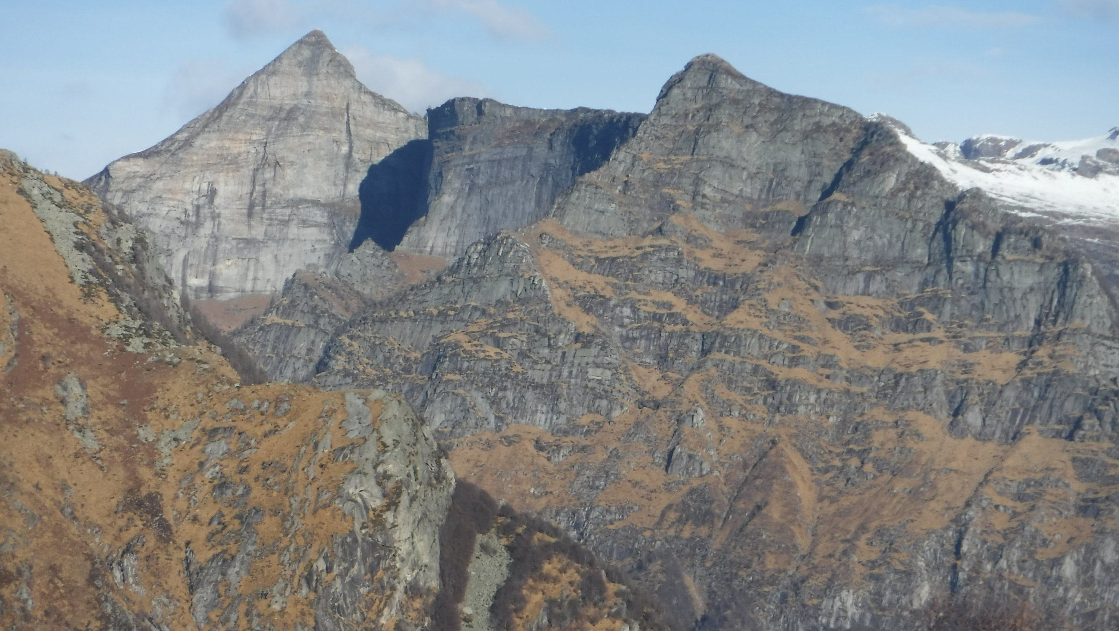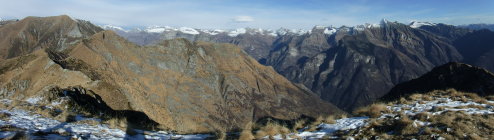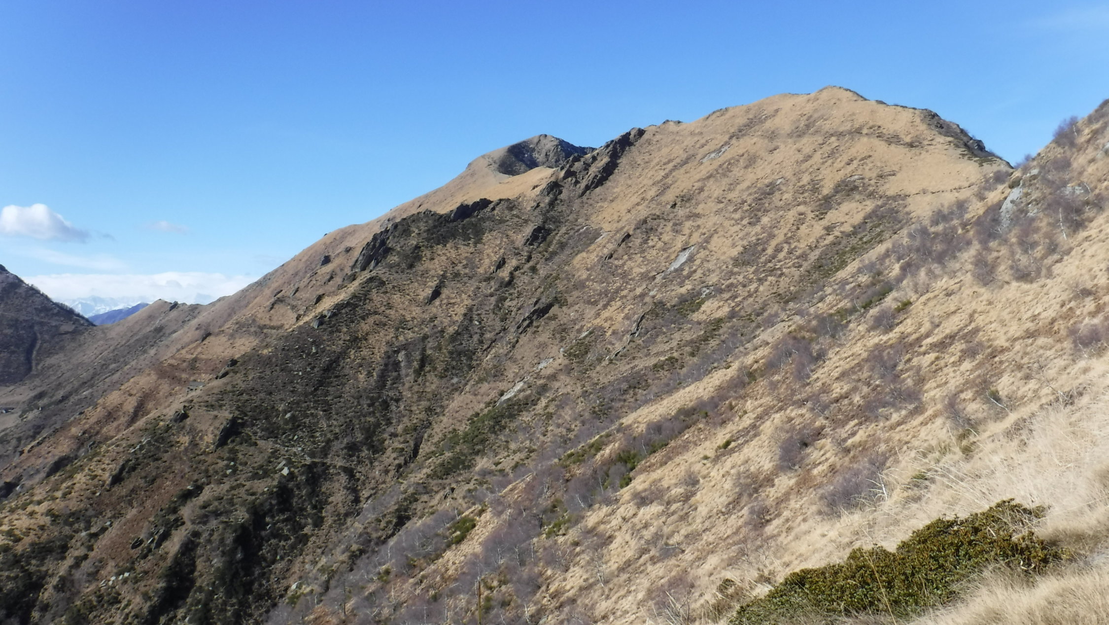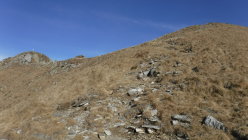 Im Abstieg vom Madone hinab zum P 1657 kam mir im unteren Bereich des Südgrats eine Wanderin entgegen. Ansonsten menschenleer. Nur die Cima della Trosa war gut besucht wegen der Nähe zur Bergstation der Locarno-Seilbahn bei der Cimetta.