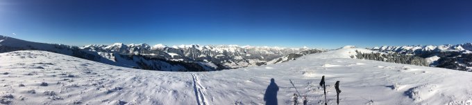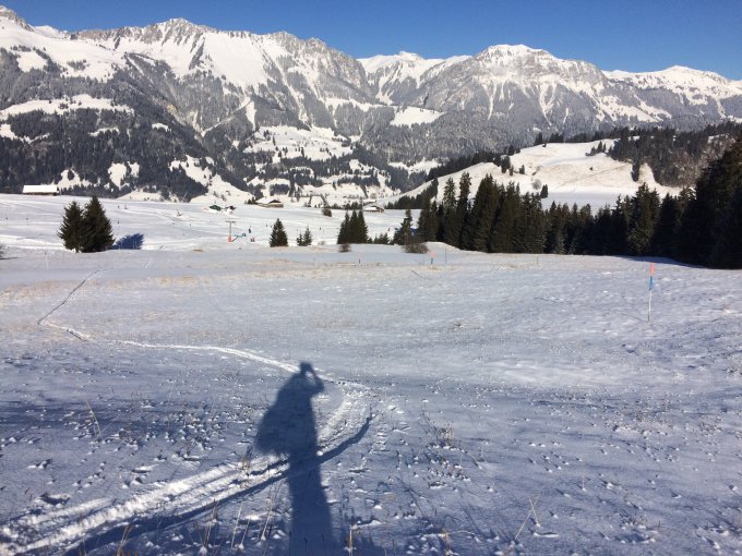 Start bei Skilift Rossberg um 12:15 Uhr bei minus 9.0°C. Wolkenlos und windstill.