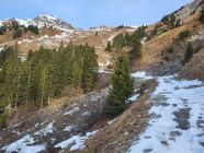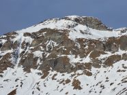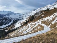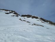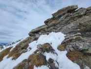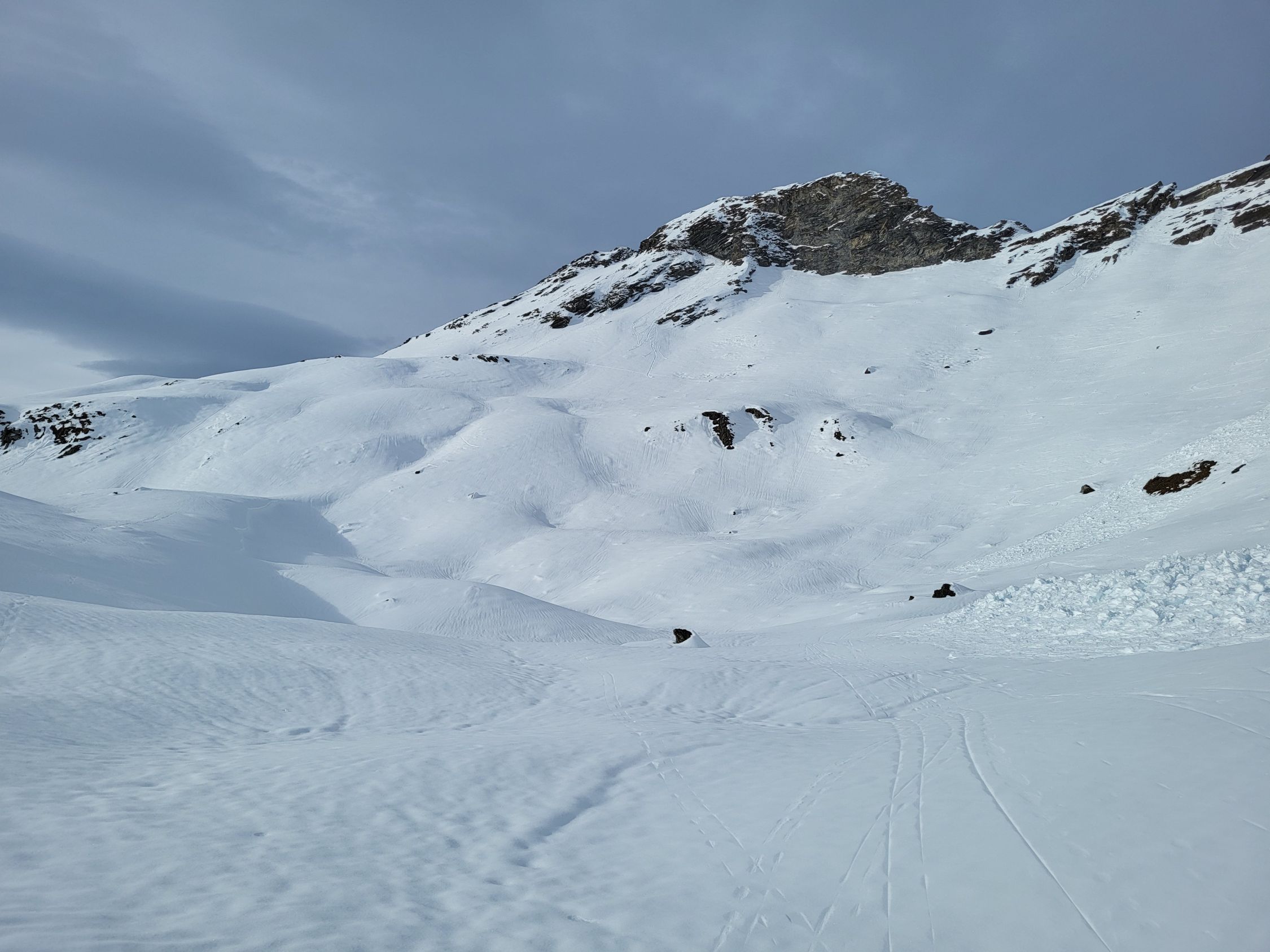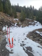 Abfahrt bis zur Hütte auf 2120 m hart, unterhalb kurz schöner Firn. Die Abfahrt auf der Fahrstrasse war etwas mühsam, da ich immer wieder einige Meter zu Fuss gehen musste wegen dem Kies auf dem Weg.