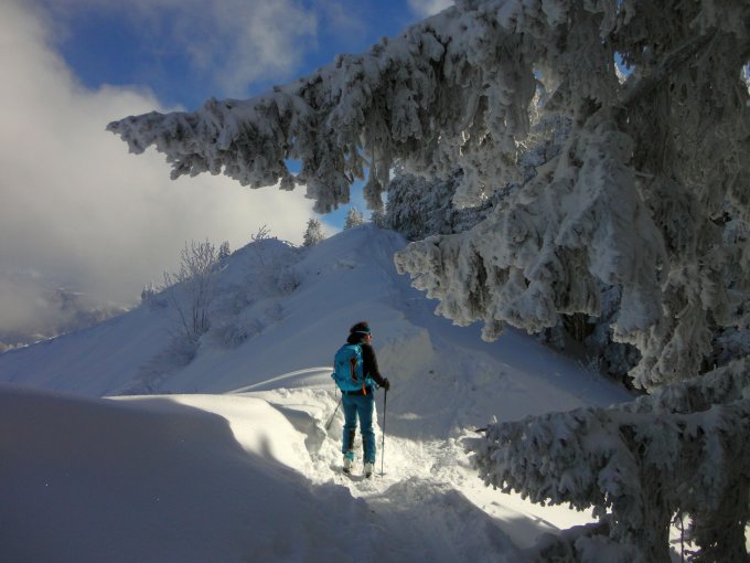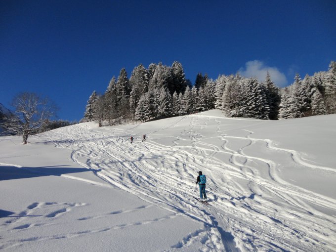 Etwa 20-30 cm Pulver ohne Grundlage, Abfahrt bis auf wenige Grasbollenkontakte jedoch recht belagfreundlich. Nur bei Querung des Waldgürtels ist vorsichtiges Abrutschen angesagt. Nachmittags erwartungsgemäß schon ziemlich zerpflügt, aber gut fahrbar.