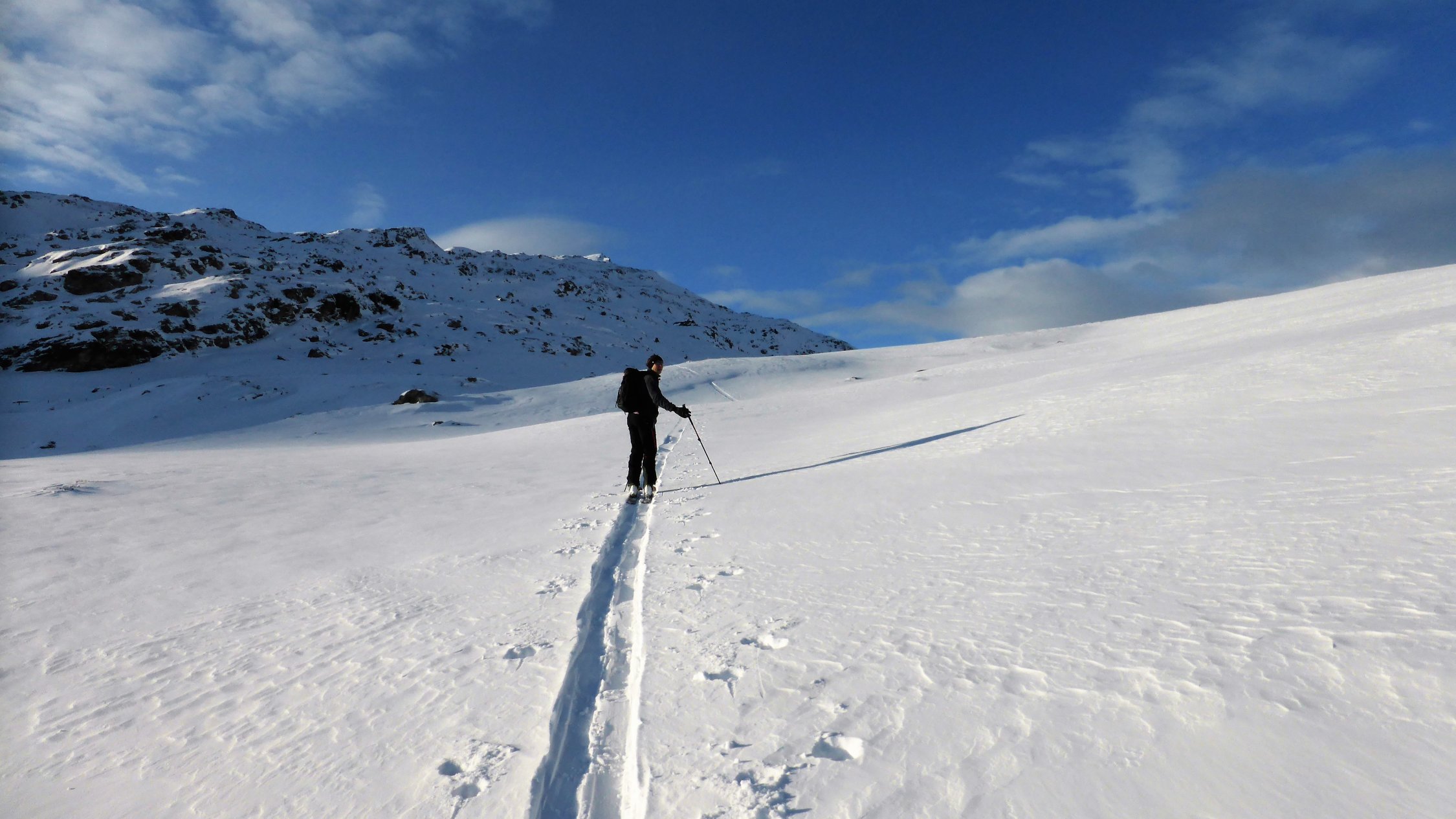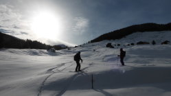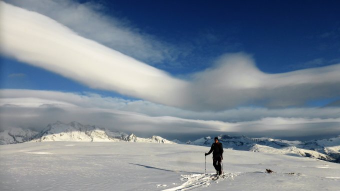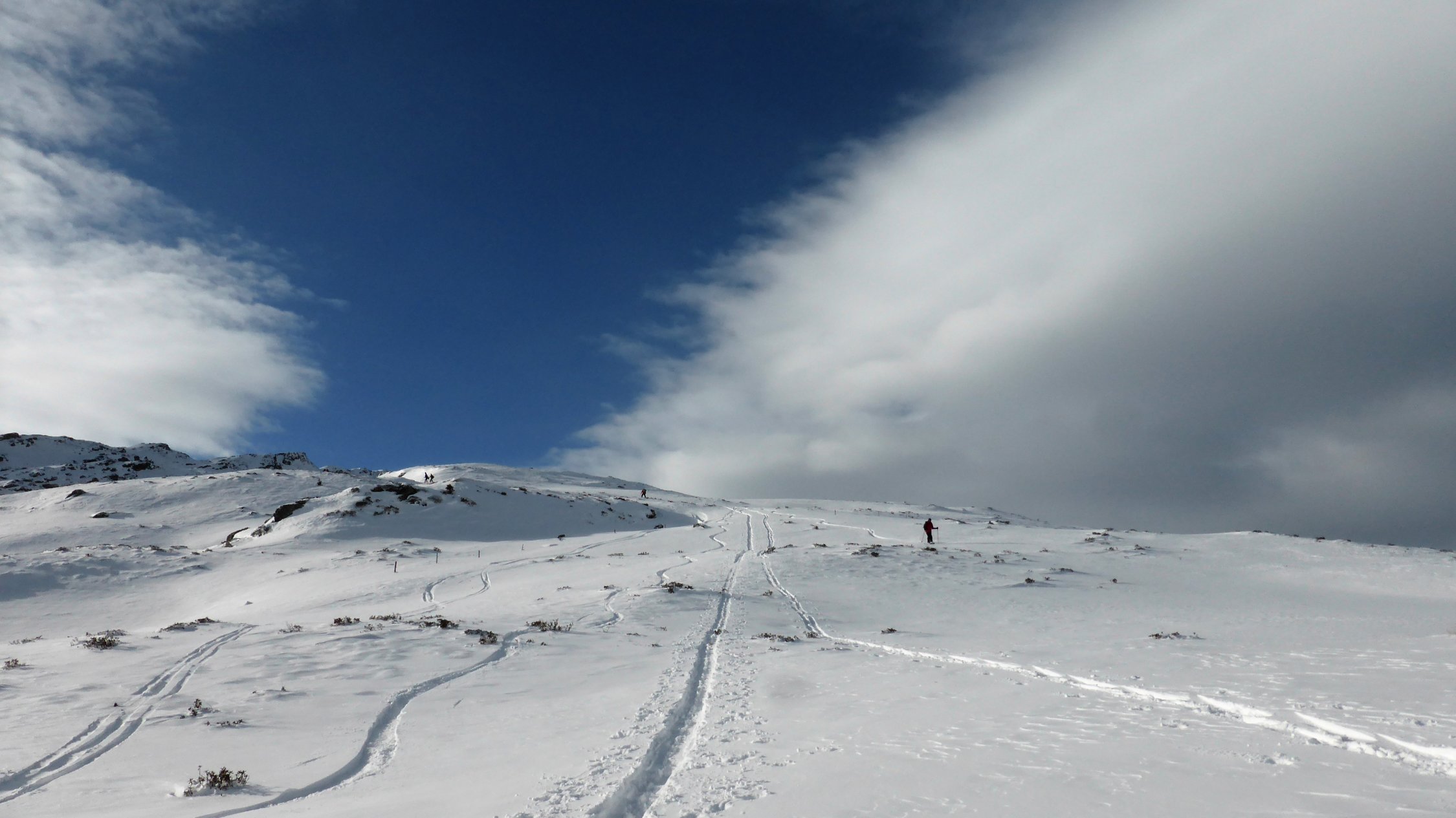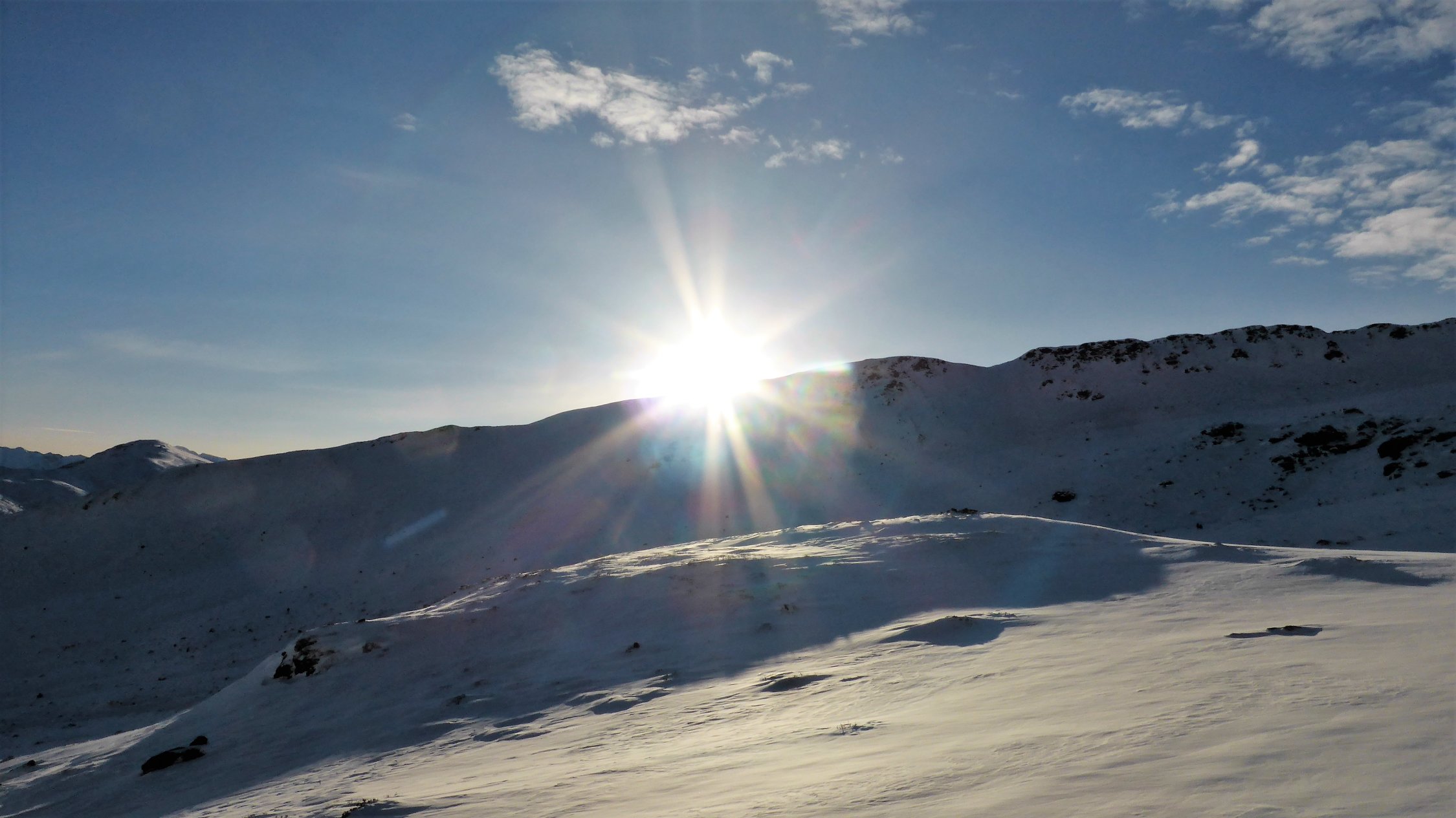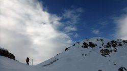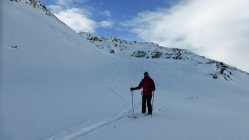 Wenig Schnee im Gebiet, unterhalb 2000 müM ohne Unterlage.Am Gipfel schwacher kalter Nordwind.
