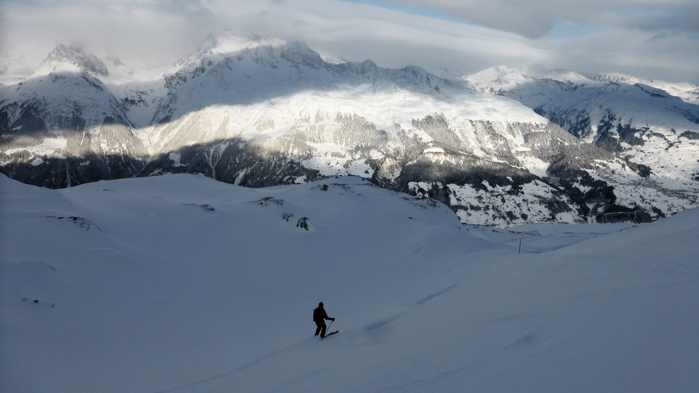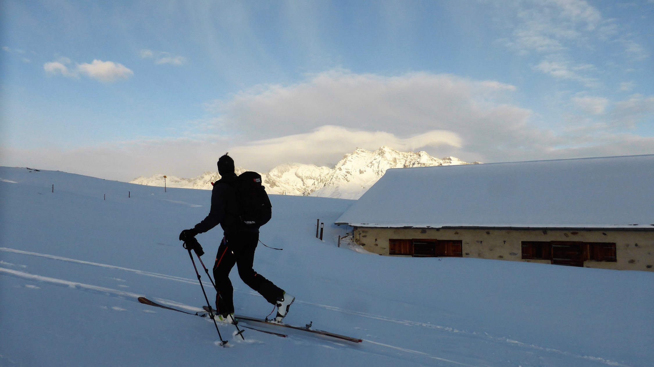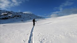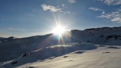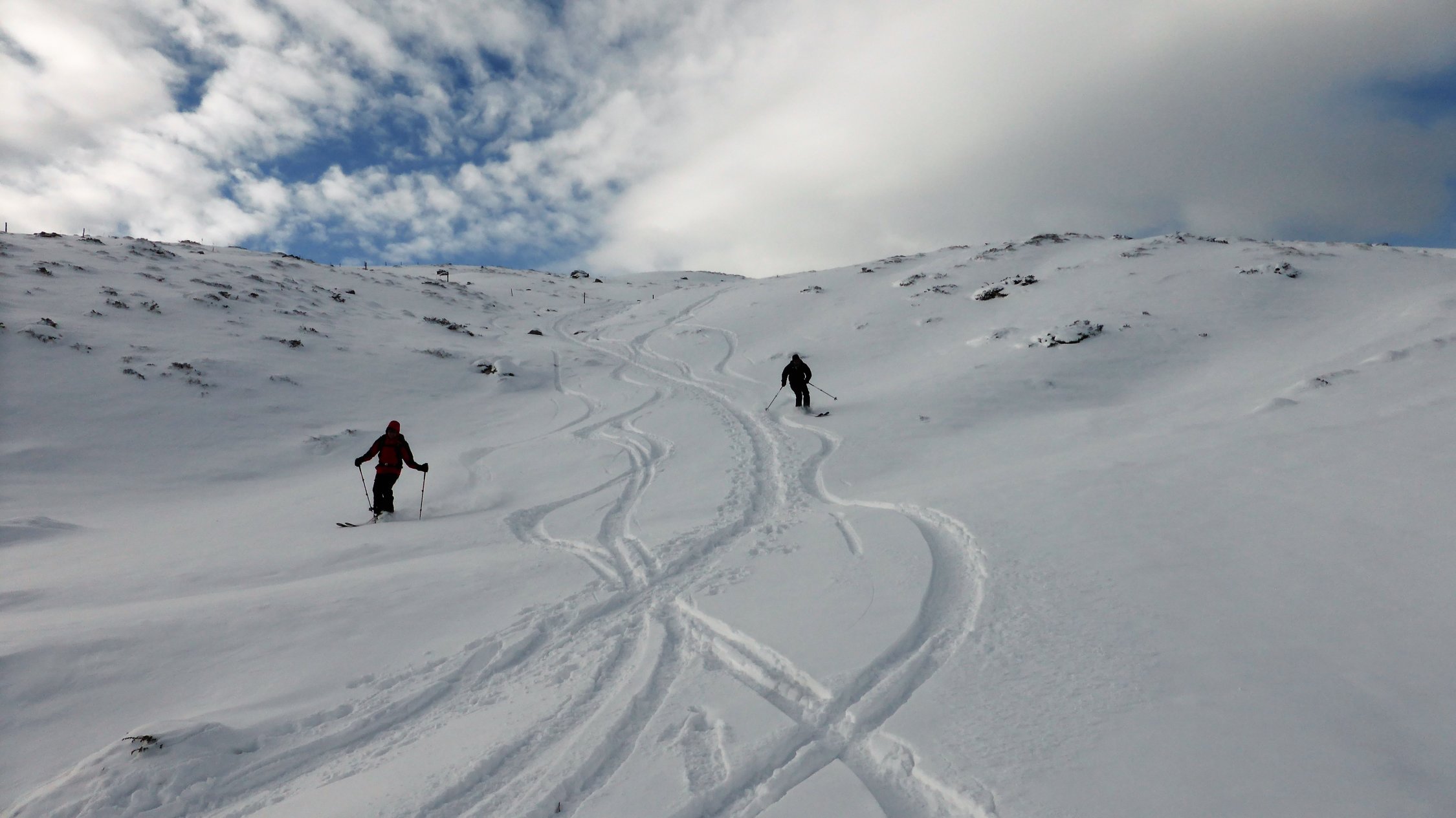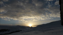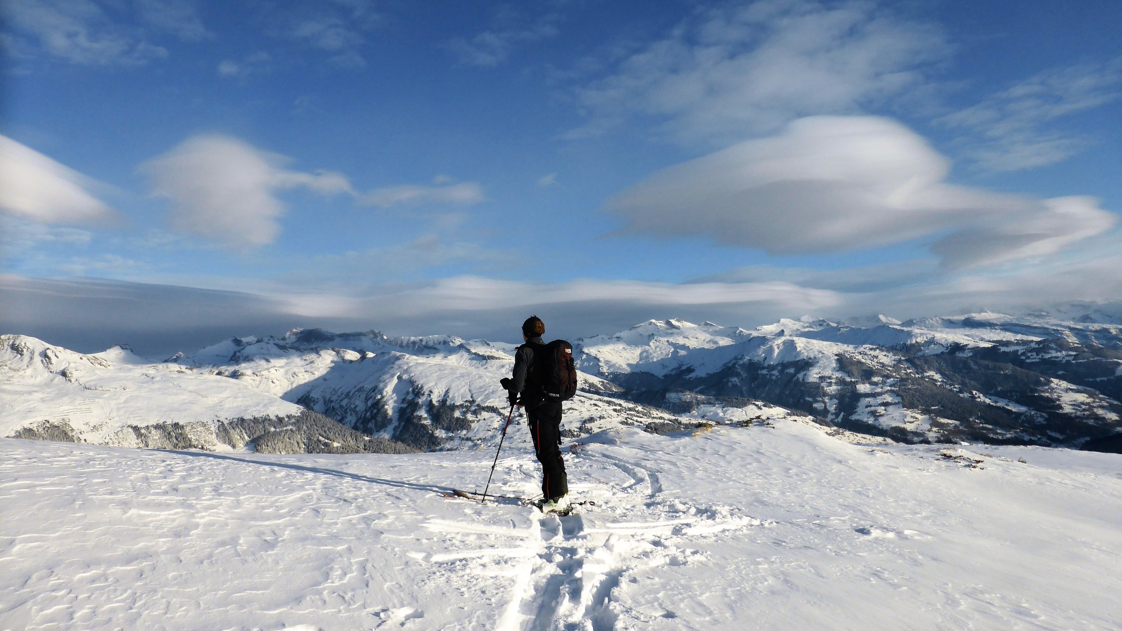 Wenig Schnee im Gebiet, unterhalb 2000 müM ohne Unterlage.Am Gipfel schwacher kalter Nordwind.