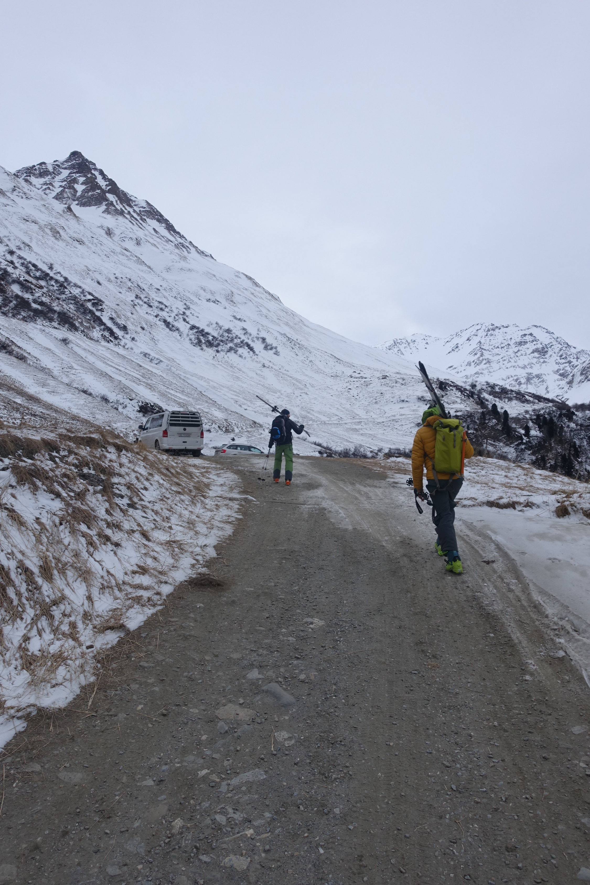 mit pw noch etwas nach hinten fahren möglich auf schneebedeckter Strasse.mit ski dank neuscnee nach 5 min loslaufen.aufstieg Südseite noch in sonne,in gipfelflanke harsteisen und in traverse steigeisen gäbig.abfahrt n-seite bei leider nicht mehr so toller sicht hart griffig gut fahrbar,tal unten raus eisig hart.alpstrasse runter knapp genügend ohne skiragen bis brücke.rückweg hoch pw direkt über apere grasflanke auf strasse gäbig.