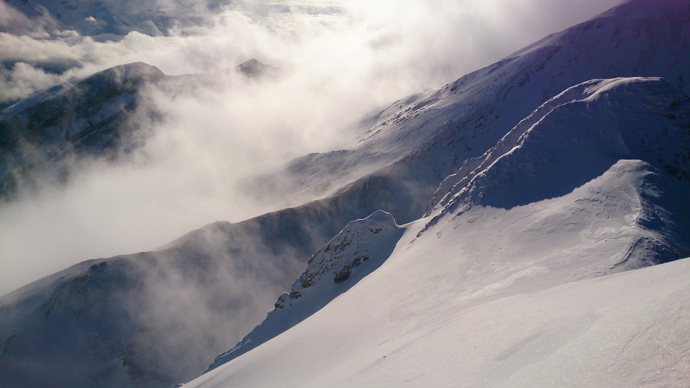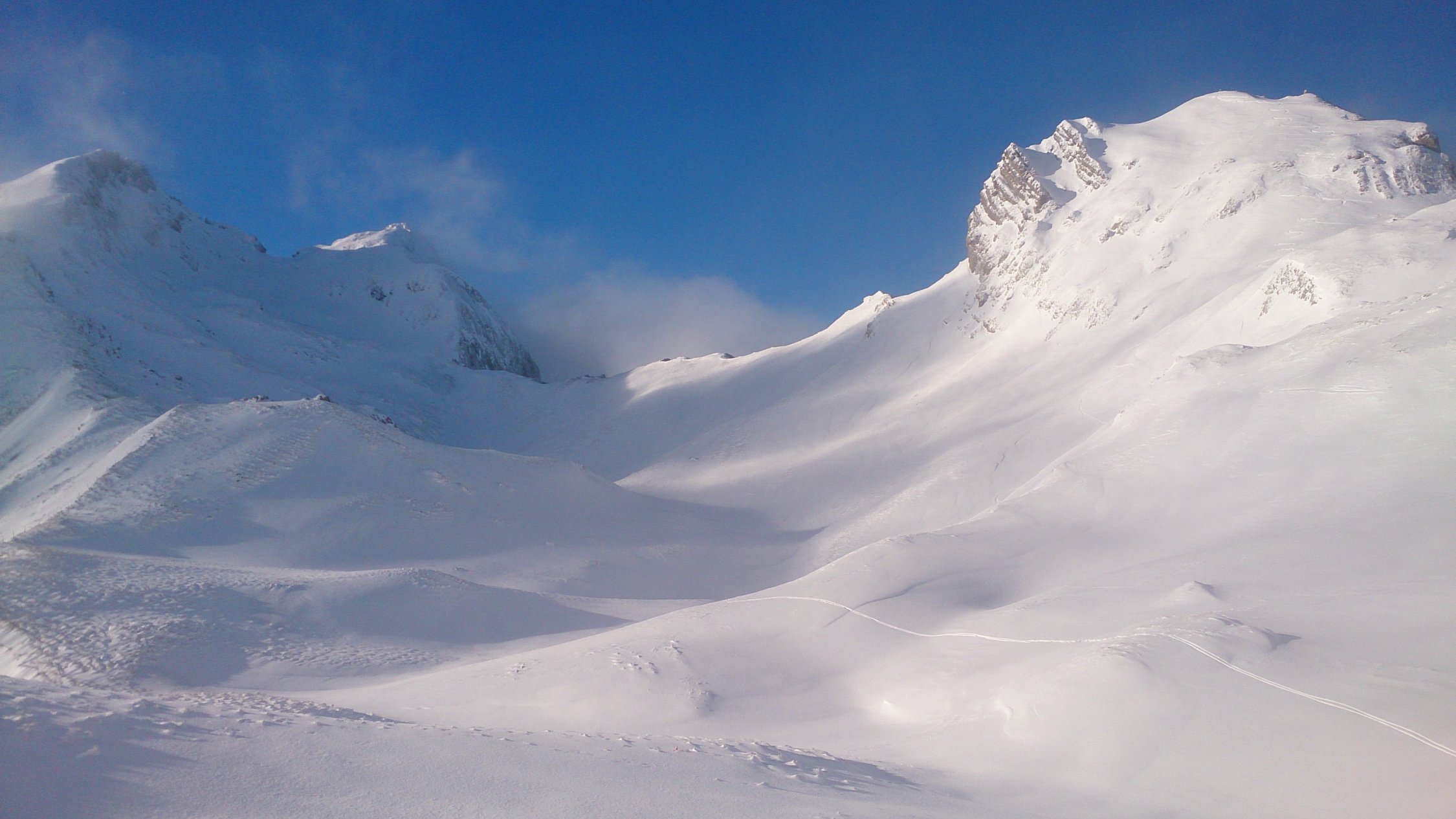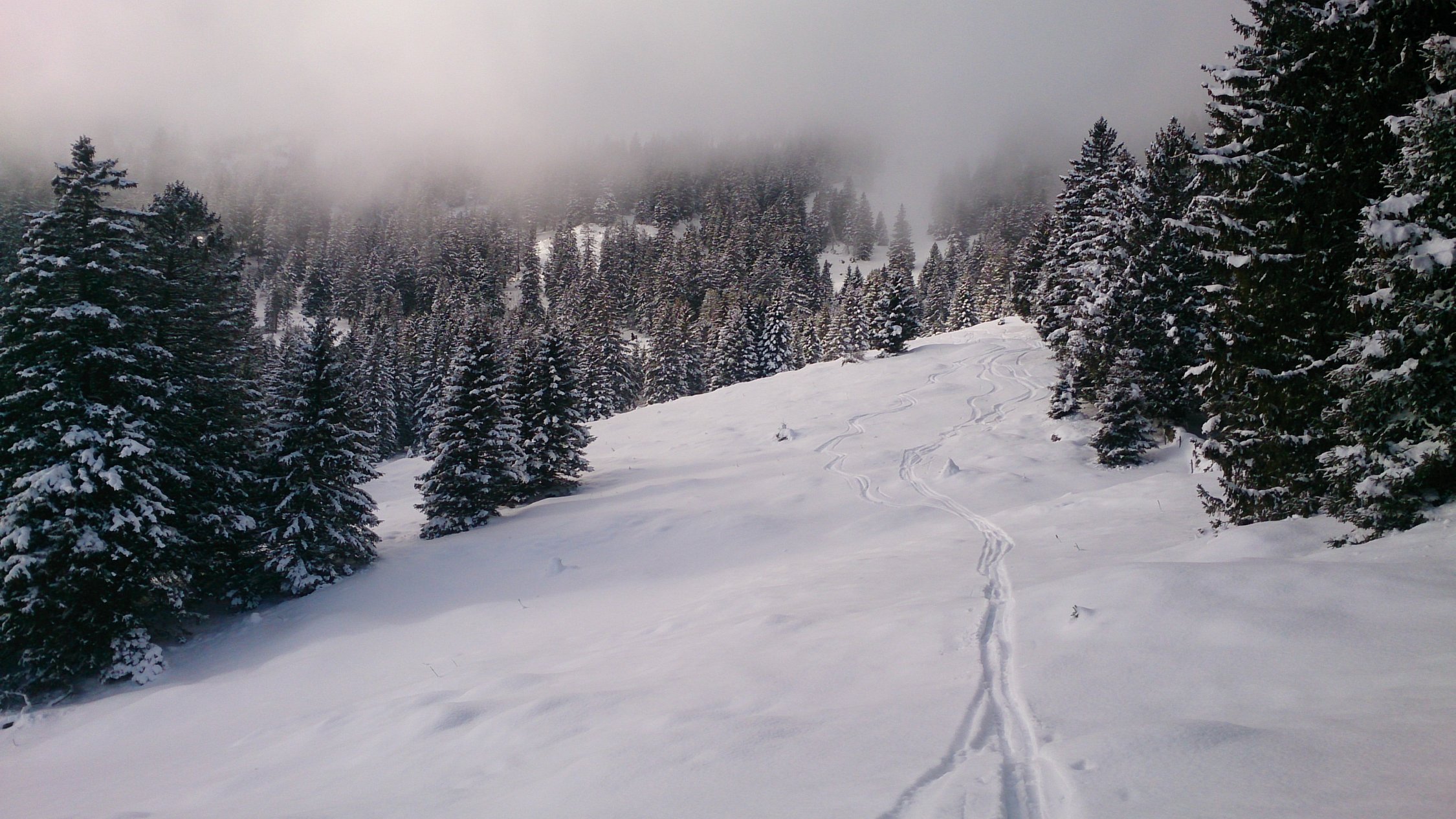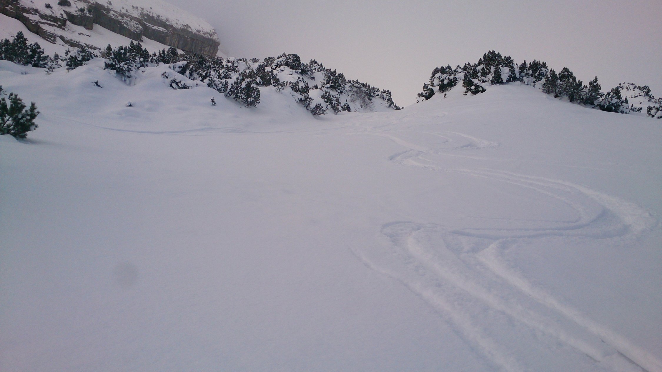 Abfahrt angenehmer etwas gesetzter Pulver - durchgehend fahrbar in Mulden, etwas Vorsicht notwendig wegen gelegentlichem Bodenkontakt (mit Glück ohne Steinkontakt)