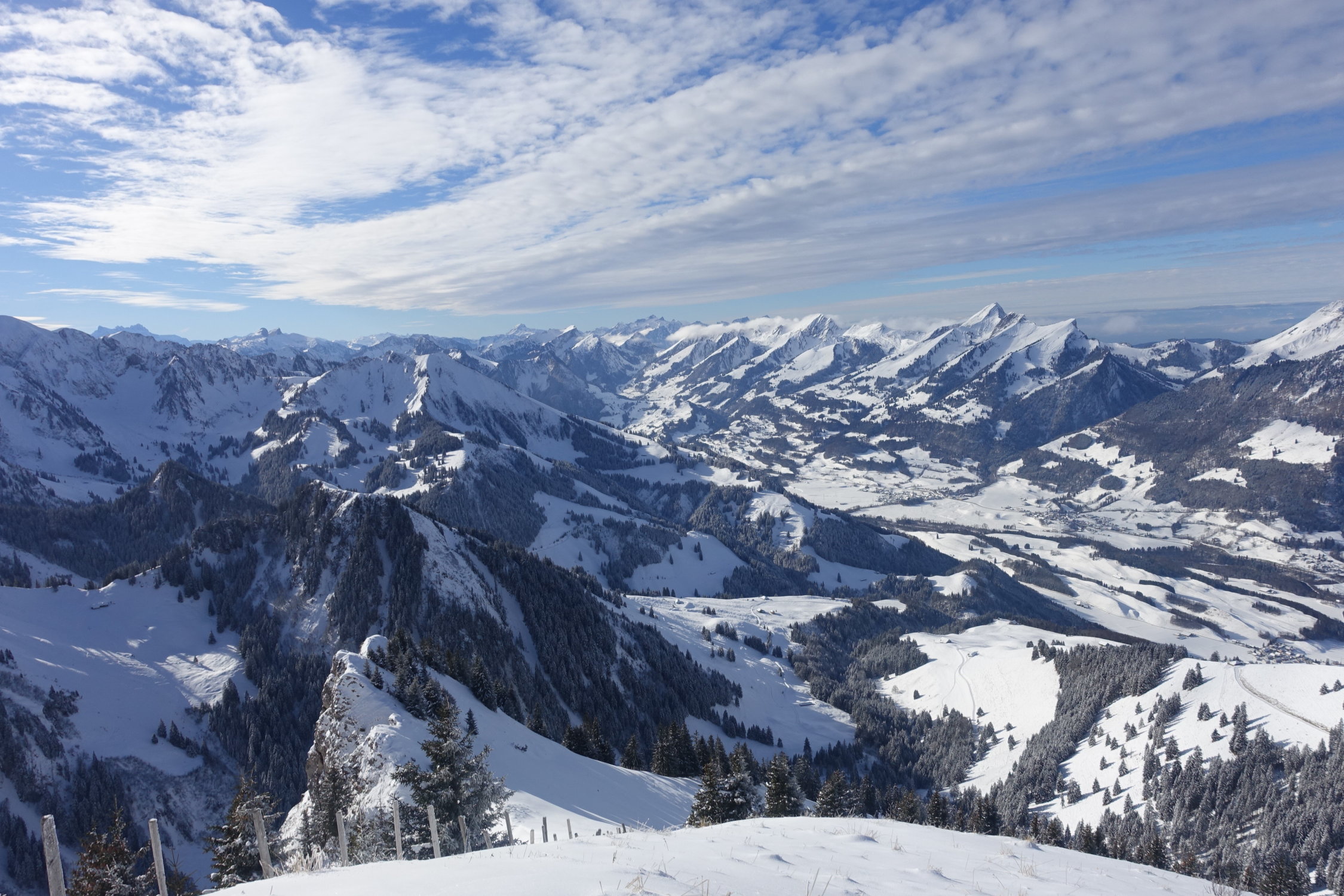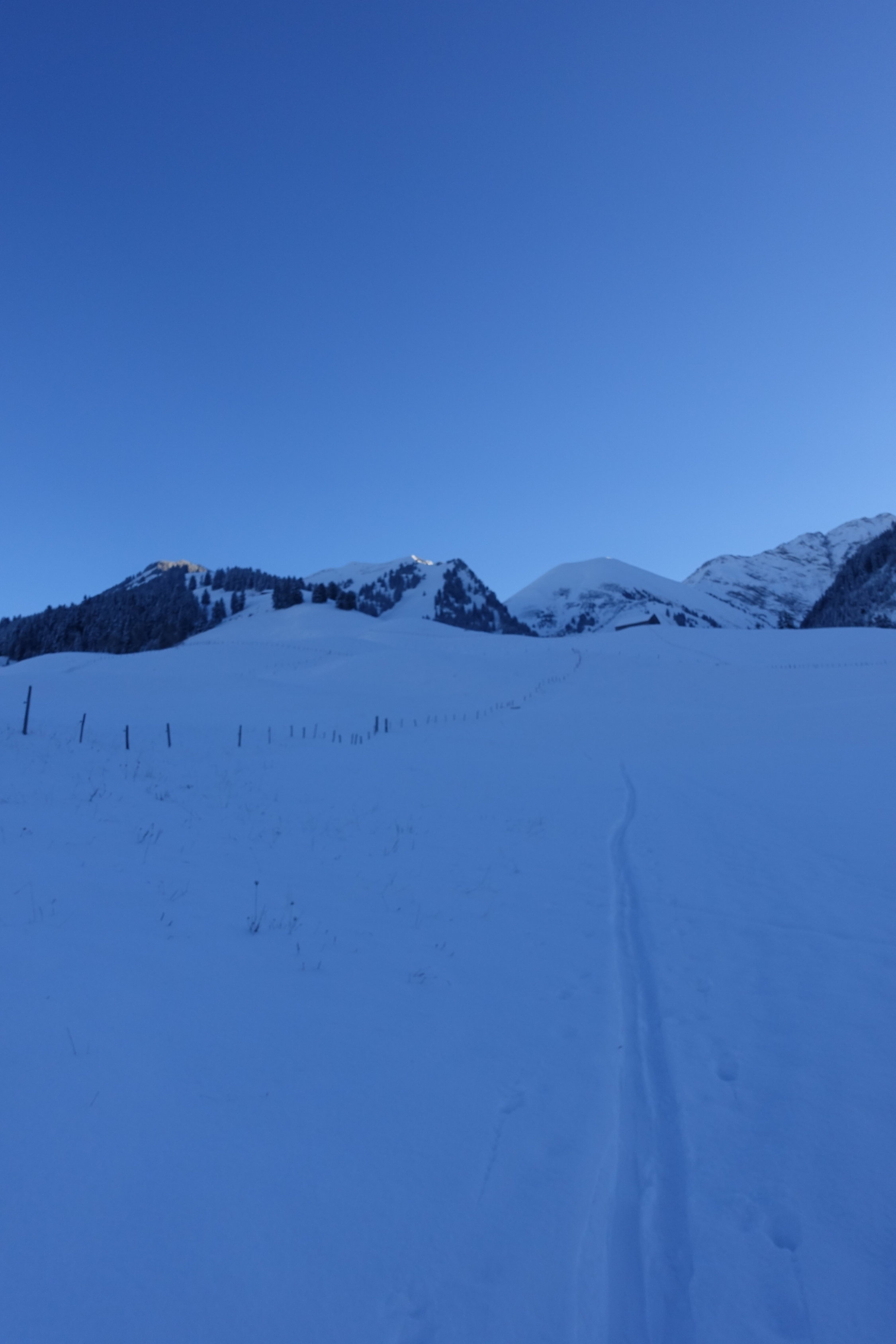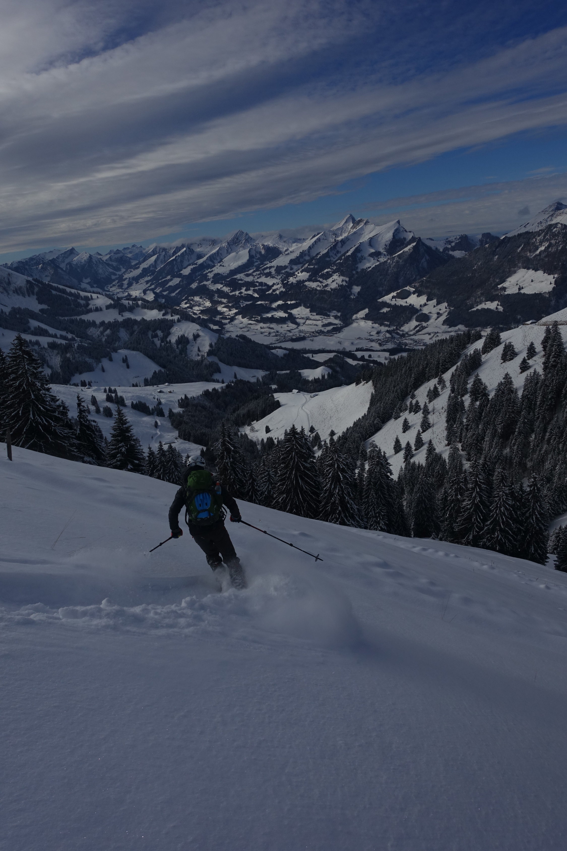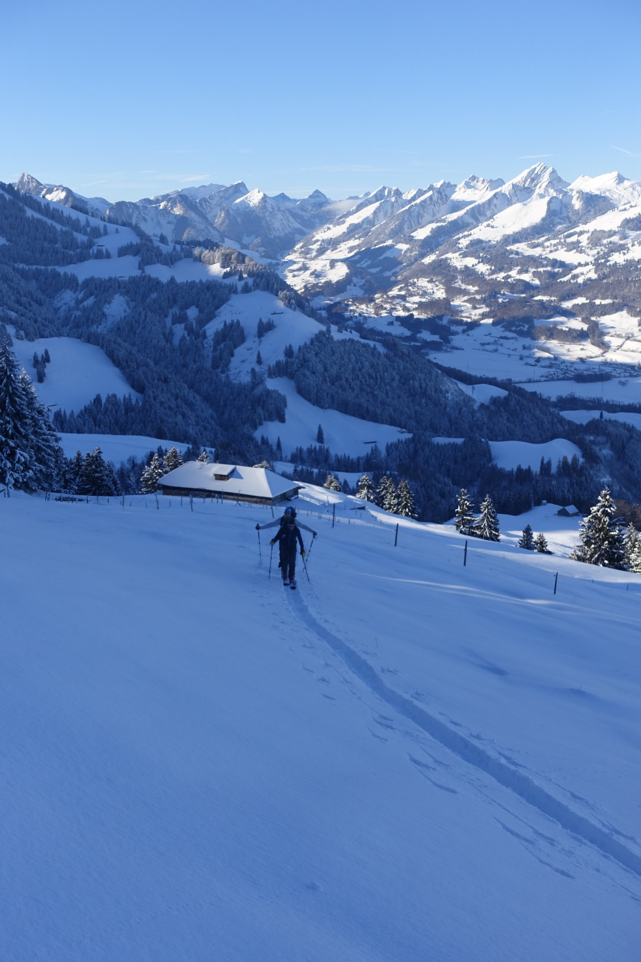 Schnee ab Start Grandvillard.Abfahrt Gipfelflanke Pulfer auf Gras ohne Unterlage.Nicht schlecht aber mit einigen Geräuschen unter Ski.Restabahrt etwas knapper Schnee vor allem Talabfahrt Wander-/Forstweg bis Kapelle(1-2 kurze Tragstellen apere Strasse).Restabfahrt auf schneebedeckter Strasse bis PW sehr gut.
