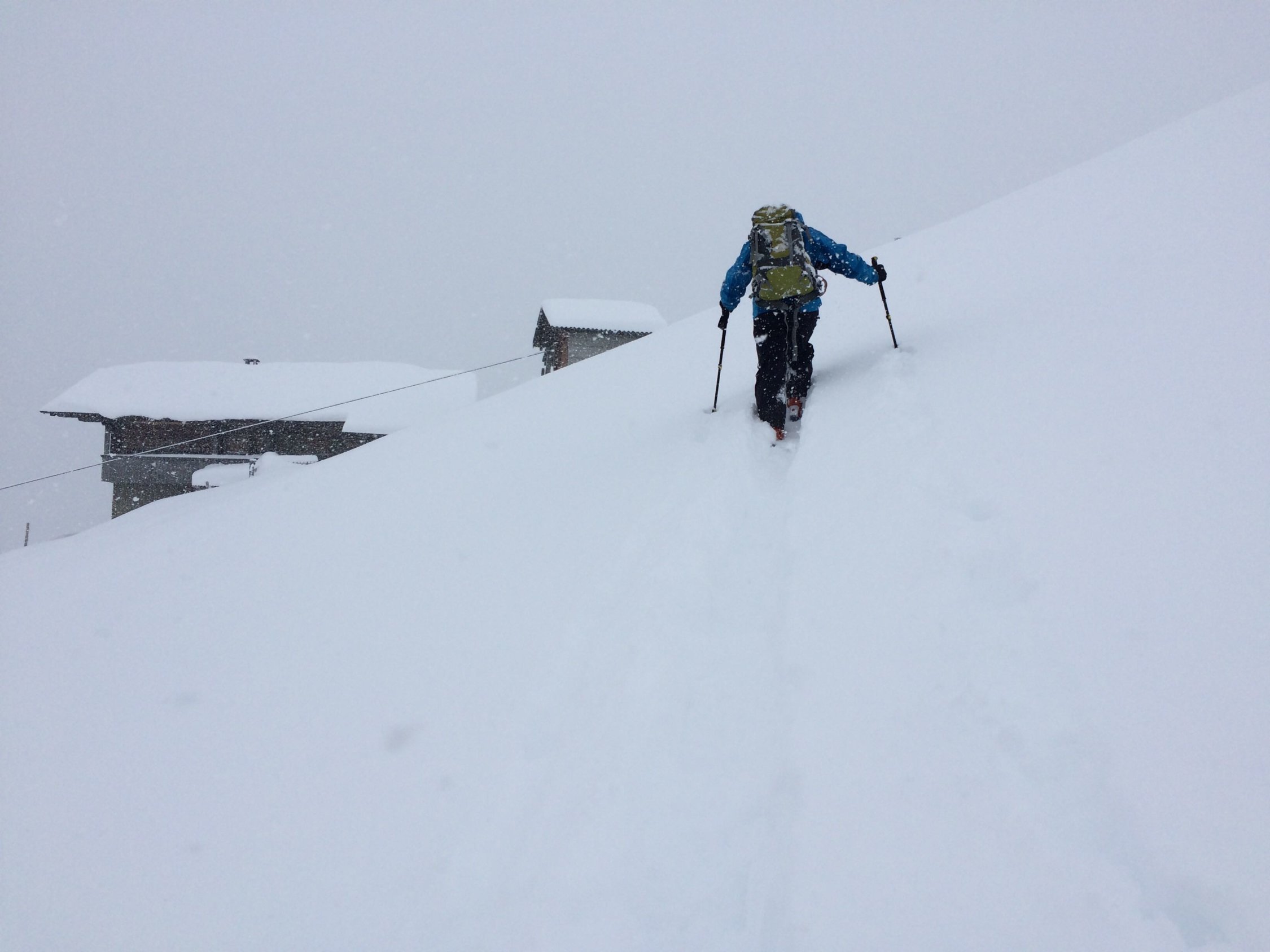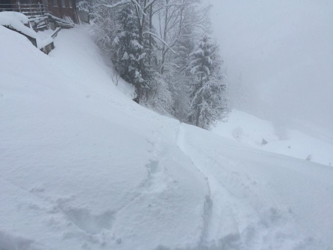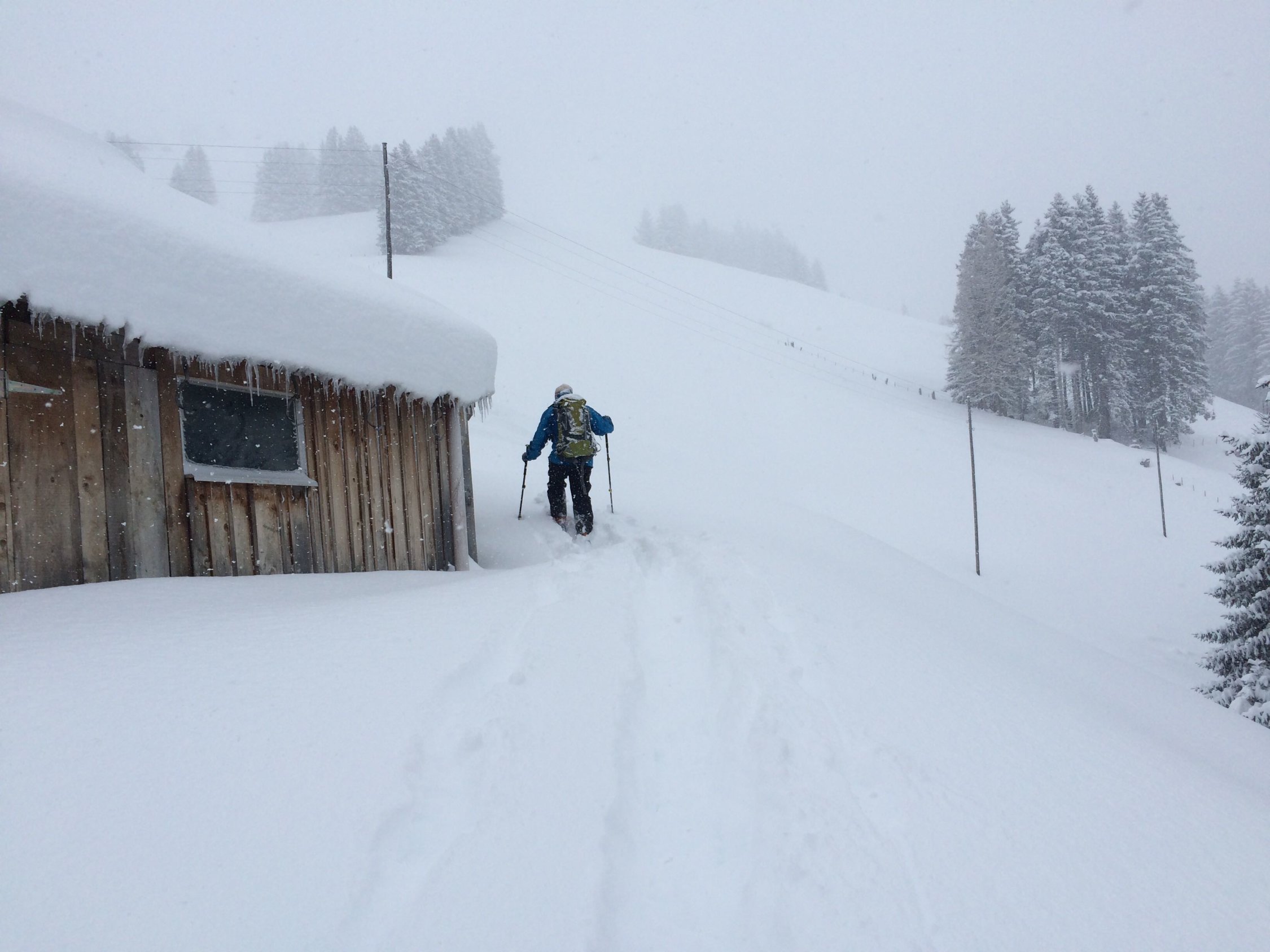 Wetter: es hat die ganze Zeit weitergeschneit, teilweise stark. Sicht beim Aufstieg ganz ok, bei der Abfahrt ... kompletter Blindflug oben, zum Glück gabs zur Orientierung den Graben, aka Aufstiegspur (wo nicht bereits wieder eingeschneit). Weiter unten ganz passable Sicht und stiebender Pulver bis über bzw. in die Ohren.
