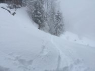 Teilweise bodenlos, was bei den eher flachen Hängen - aber alles andere wäre eh zu gefährlich gewesen - zu Steckenbleib-Gefahr führte, aber wir nehmen jede Flocke dankbar, daher wirklich kein Grund zum Klagen. Unter dem Neuschnee keine Unterlage, brauchts aber bei dieser Tour auch nicht wirklich. Ausserdem hat im Moment auch der unterste Hang genug Schnee, um ohne Bodenkontakt zu fahren. Lockerer Pulver, so gut wie ohne Windeinfluss gefallen.