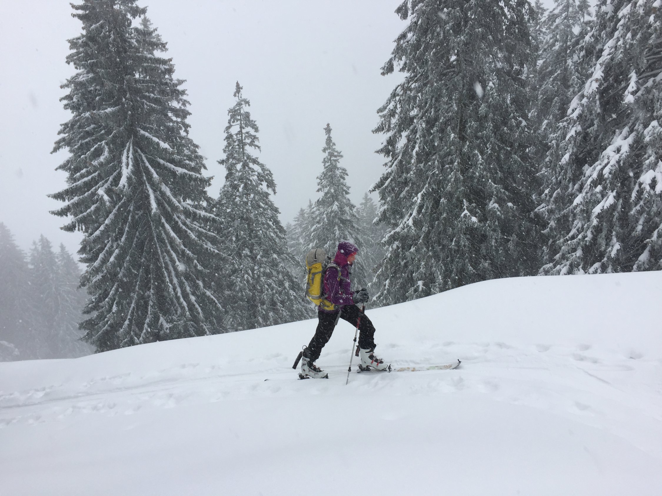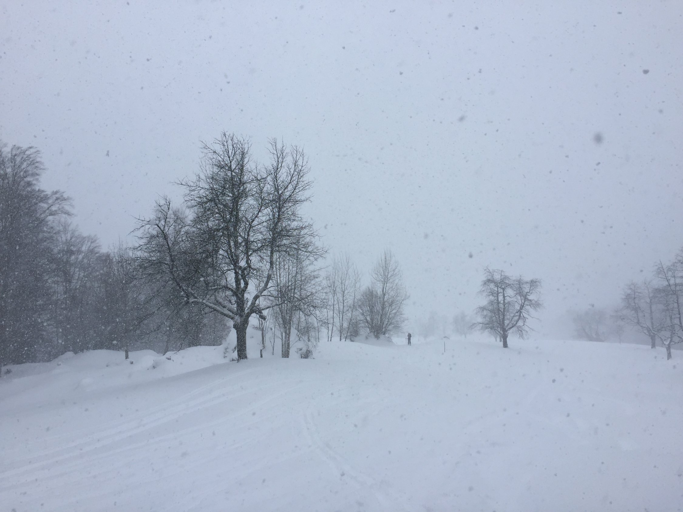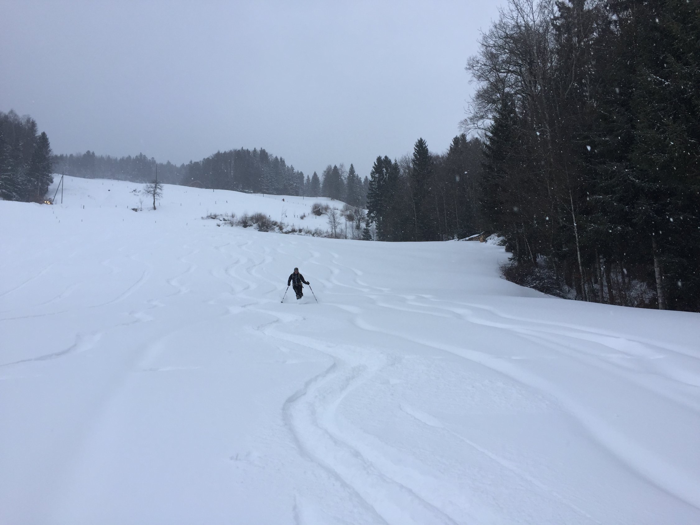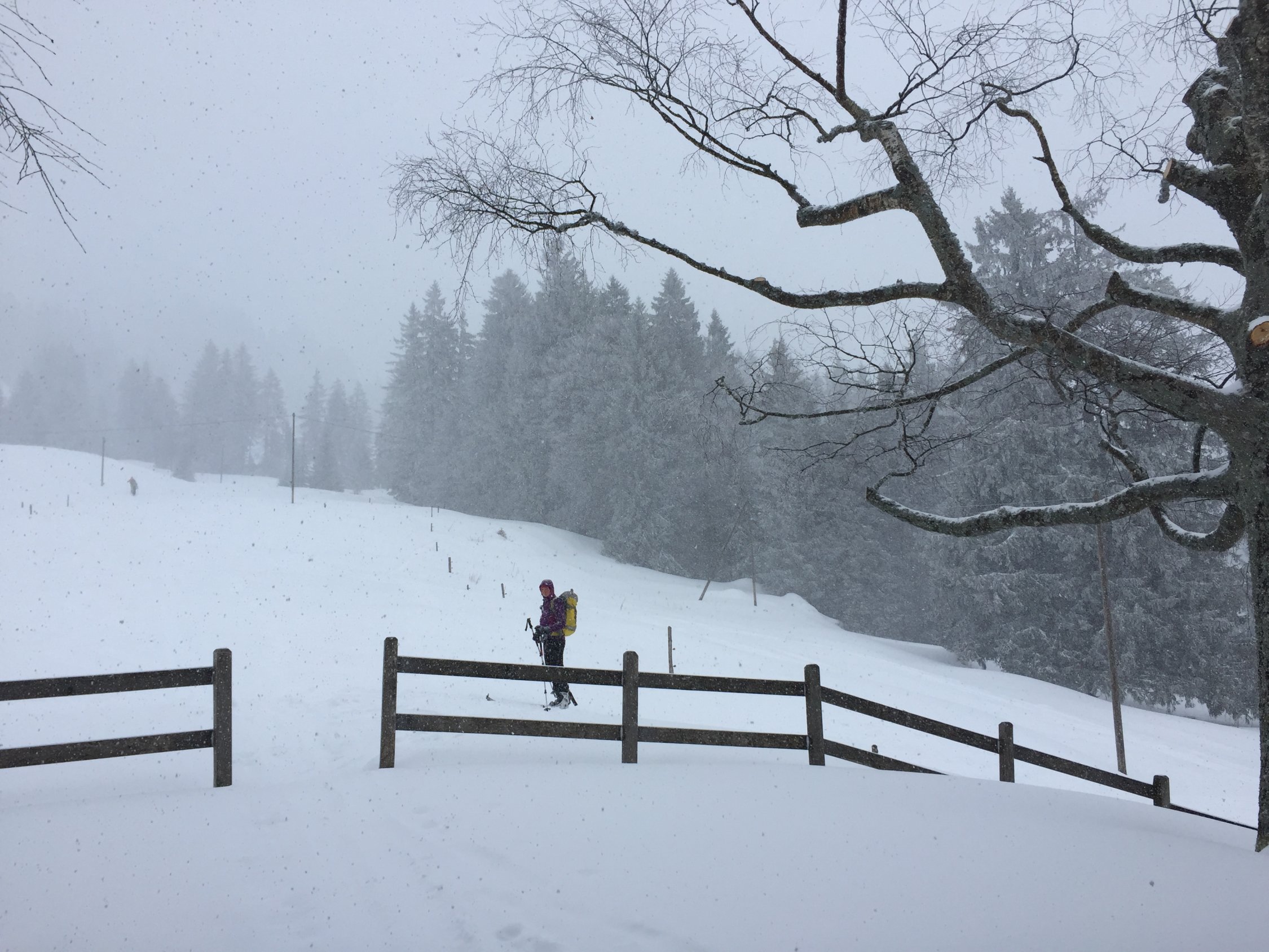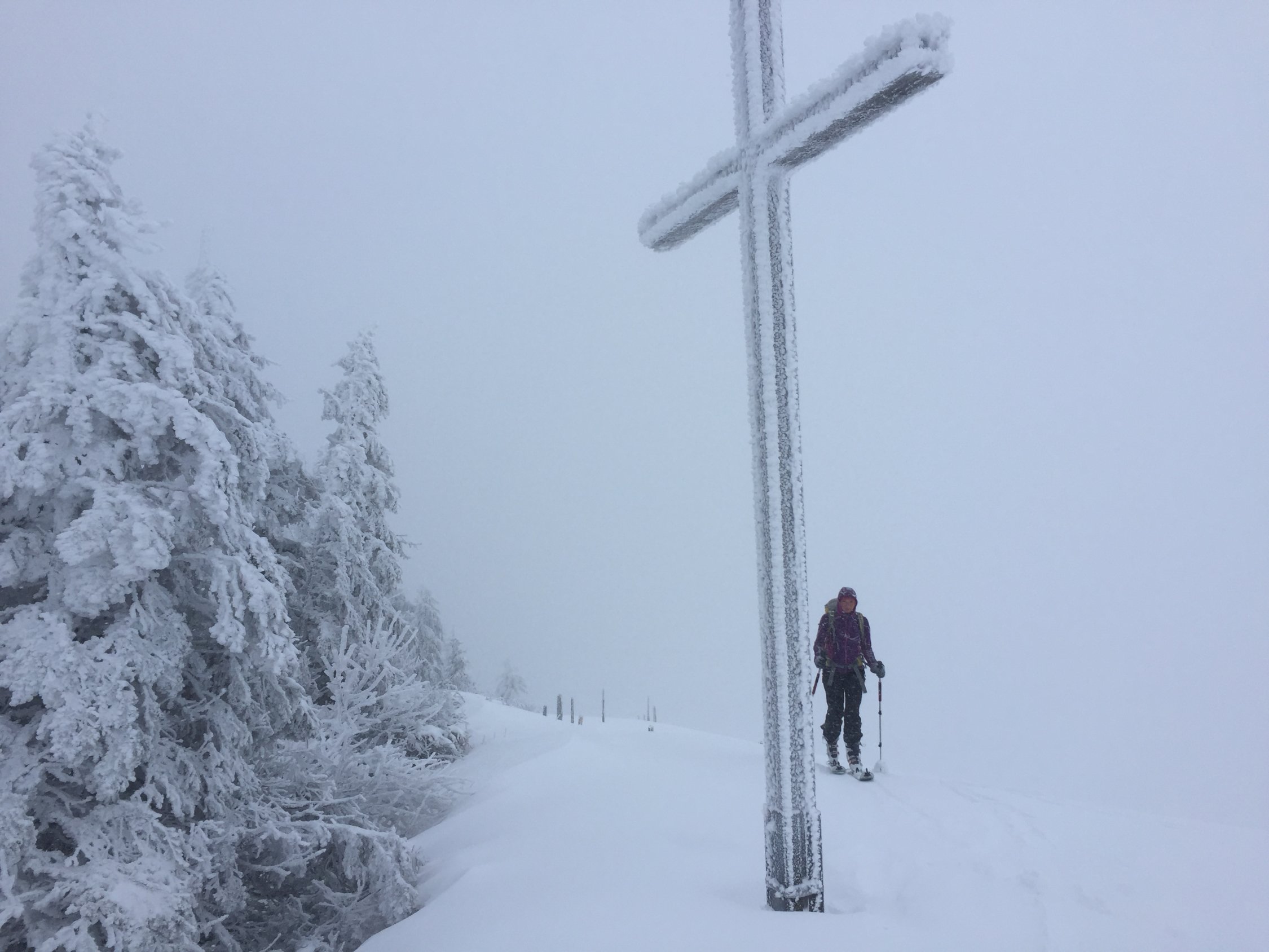 Auf den ersten ca. 150 hm ist der Schnee noch knapp aber dank des grasigen Untergrundes kein Problem. Abfahrt bis Steinerberg von daher möglich. Im Gipfelbereich stelleweise auf die Harschkruste abgeblasen. Sonst reichlich schöner Neuschnee. Heute war die Sicht wegen des anhaltenden Schneefalls sehr eingeschränkt.