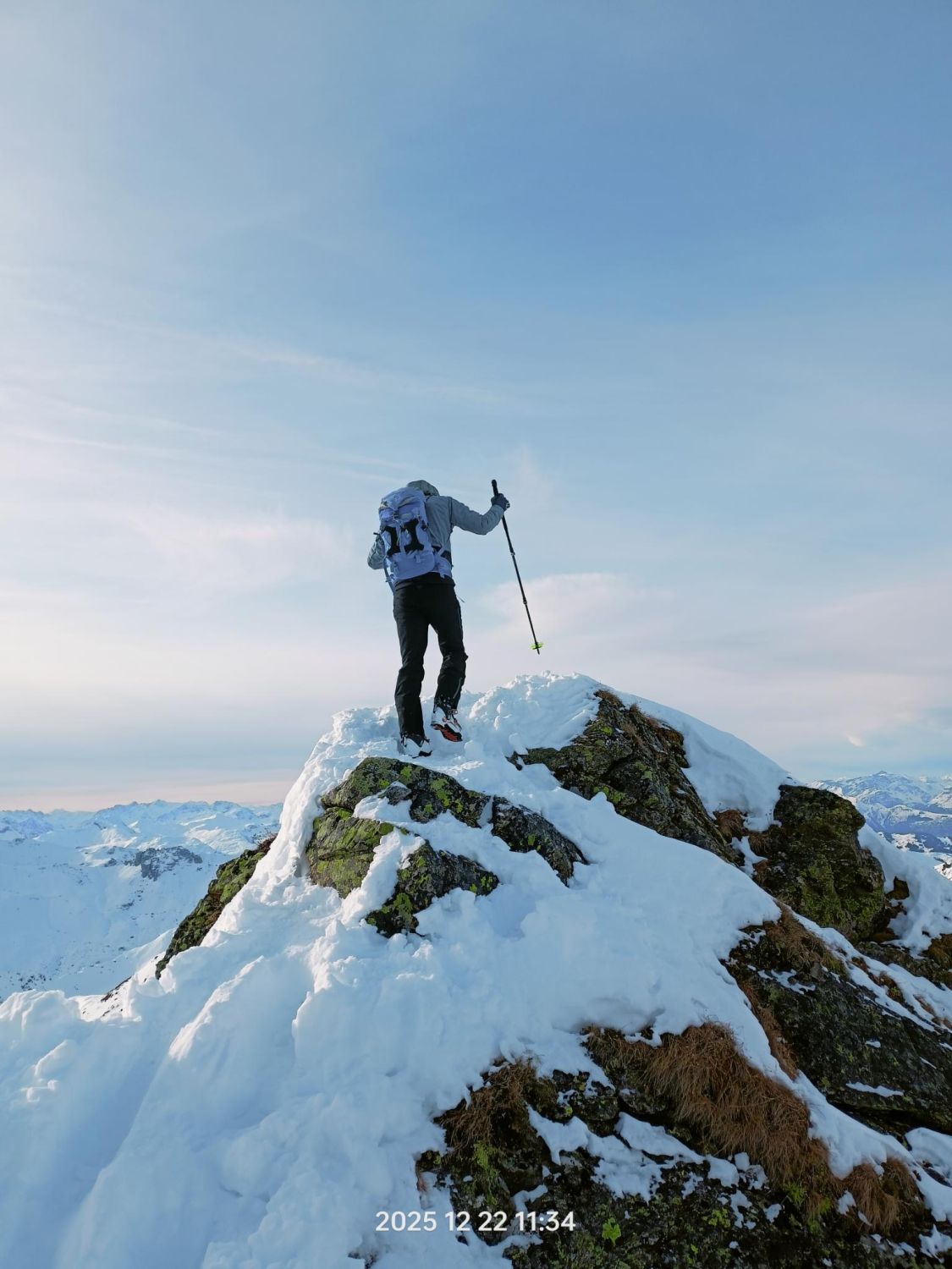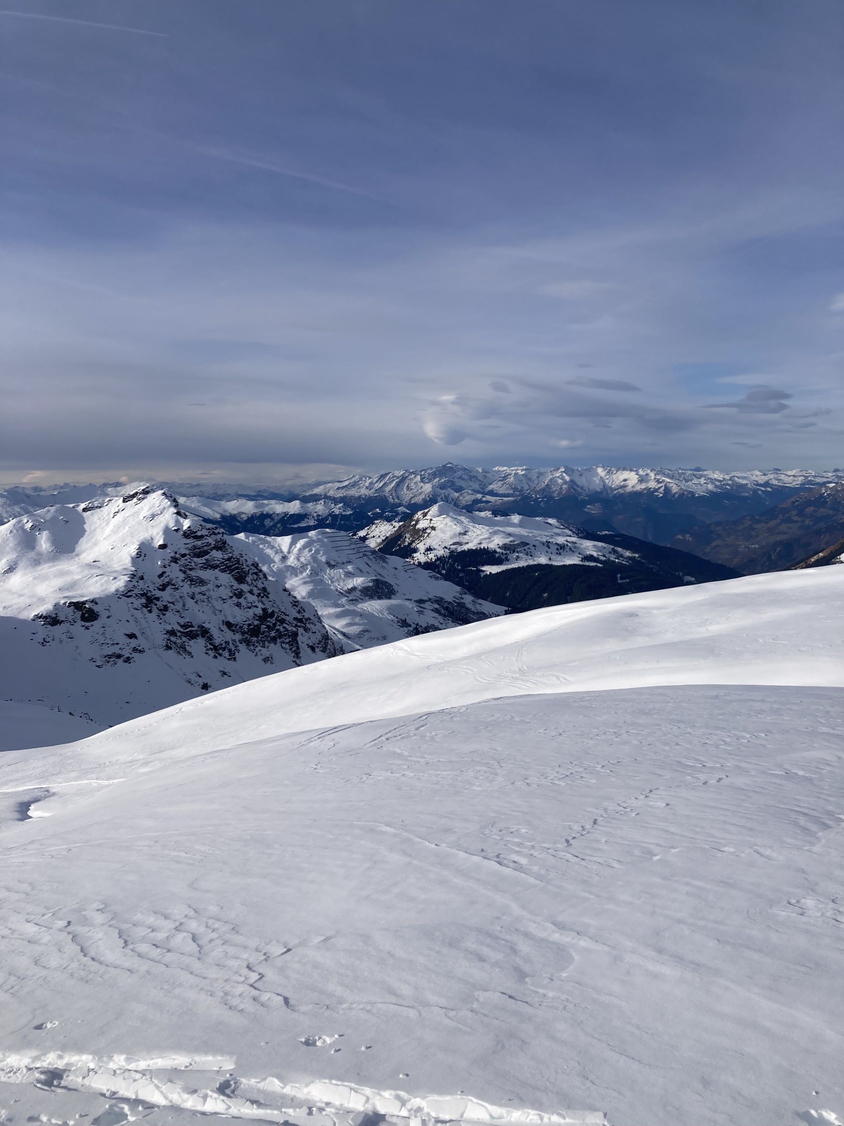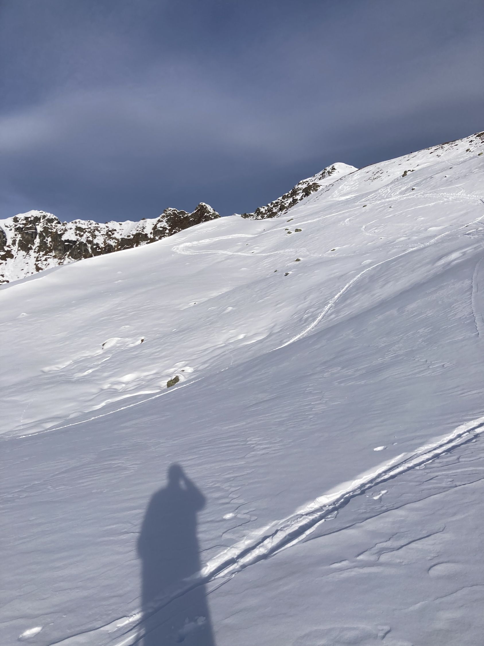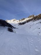 Bis Gargellner Alpe(1733) Skipiste hinauf mit viel Kunstschnee. Danach Skipiste Täli hinauf. Piste geschlossen. Piste ist bereits planiert, aber ruppig in der Abfahrt. Piste bis ca. 2088 m dann Richtung St. Antöner Joch. Westseitig 20 hm Abstieg zu Fuß. Ab Skidepot guter Trittschnee bis zum Gipfel.