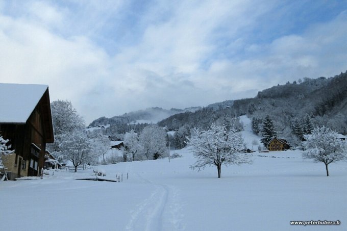 Gute Spur war vorhanden sodass wir die Lücken durch die Stacheldrahtzäune gut gefunden haben. Super Abfahrt mit lockerem Pulverschnee oft bis zu den Knien. Ab der Mitte sind wir nochmals aufgestiegen und haben den Traum nochmals genossen. Schöne Abfahrt bis zum Schulhaus möglich - unten war der Schnee leicht feucht, aber immer noch gut zu fahren.