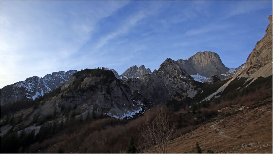 Zur Goinger Halt hinauf geht ebenfalls ein guter Pfad, aber zwichendurch gibt es ein paar heikle Stellen. Grödel sind auf jeden Fall sinnvoll, vor allem am Morgen wenn alles hart gefroren ist.