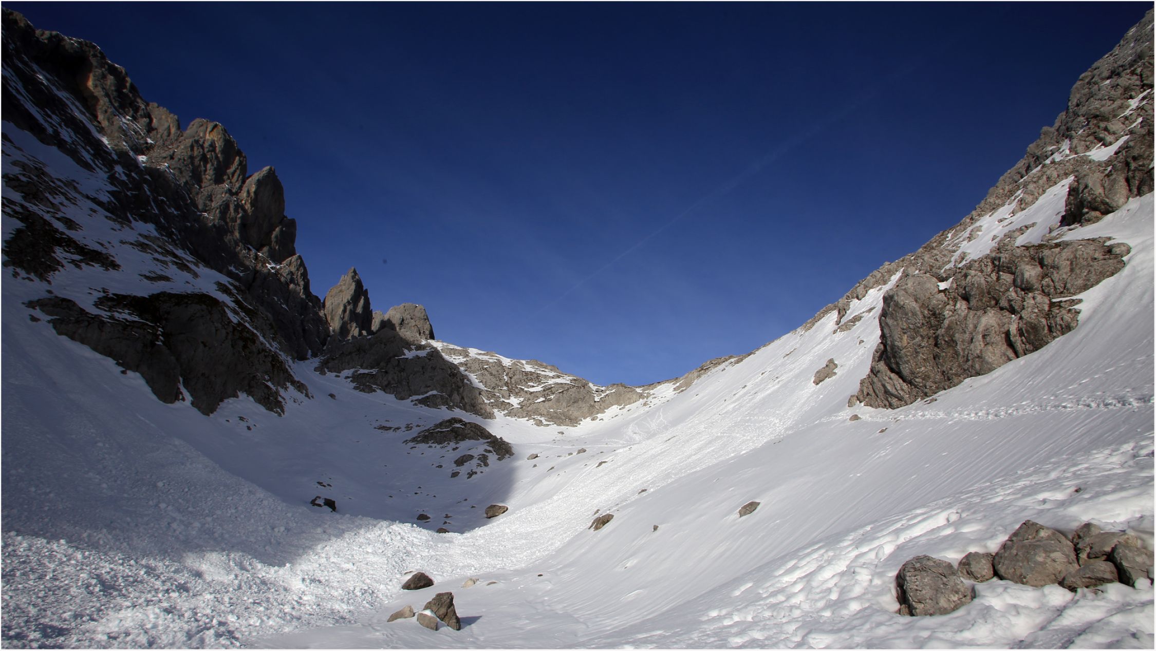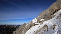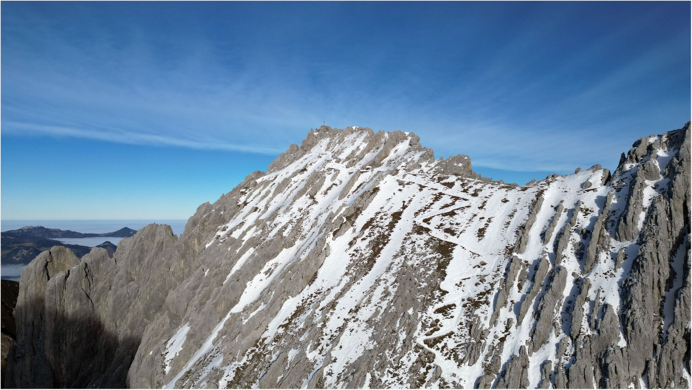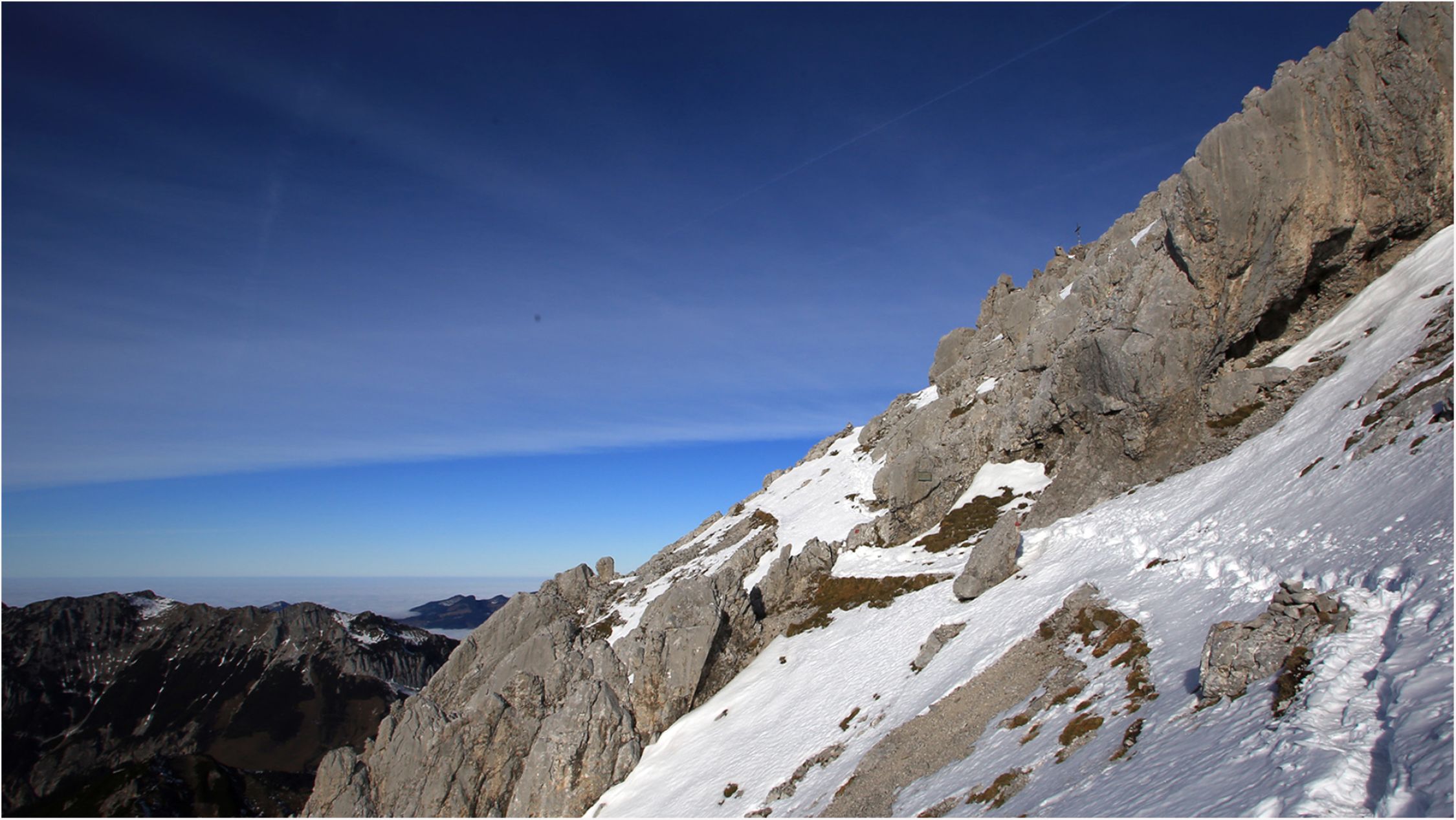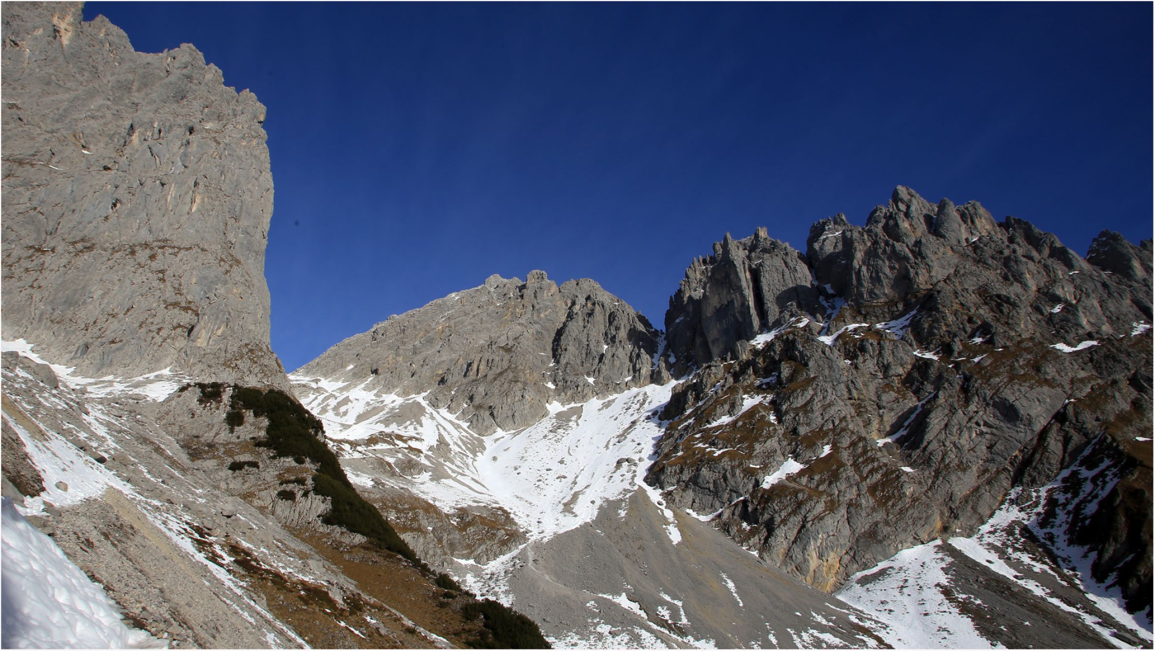 Ebenfalls wenig Schnee liegt auf der Südseite des Wilden Kaisers, z. B. Scheffauer (Steig wegen Felssturz gesperrt) gleich daneben die Kopfkraxn, so gut wie kein Schnee.