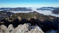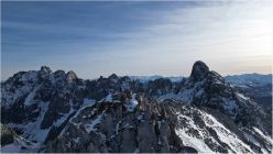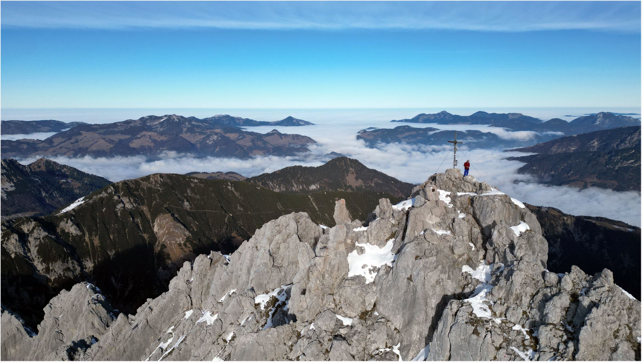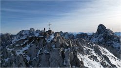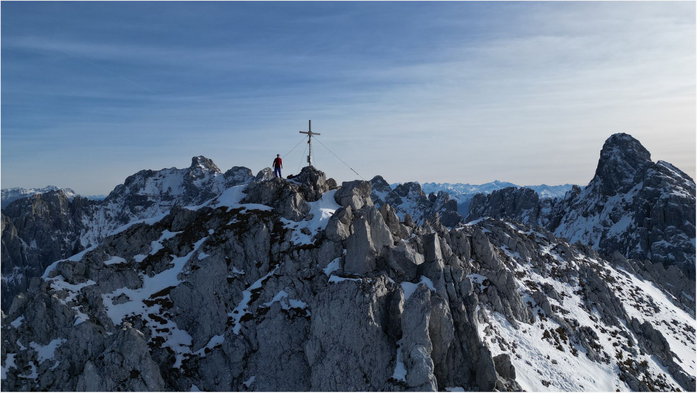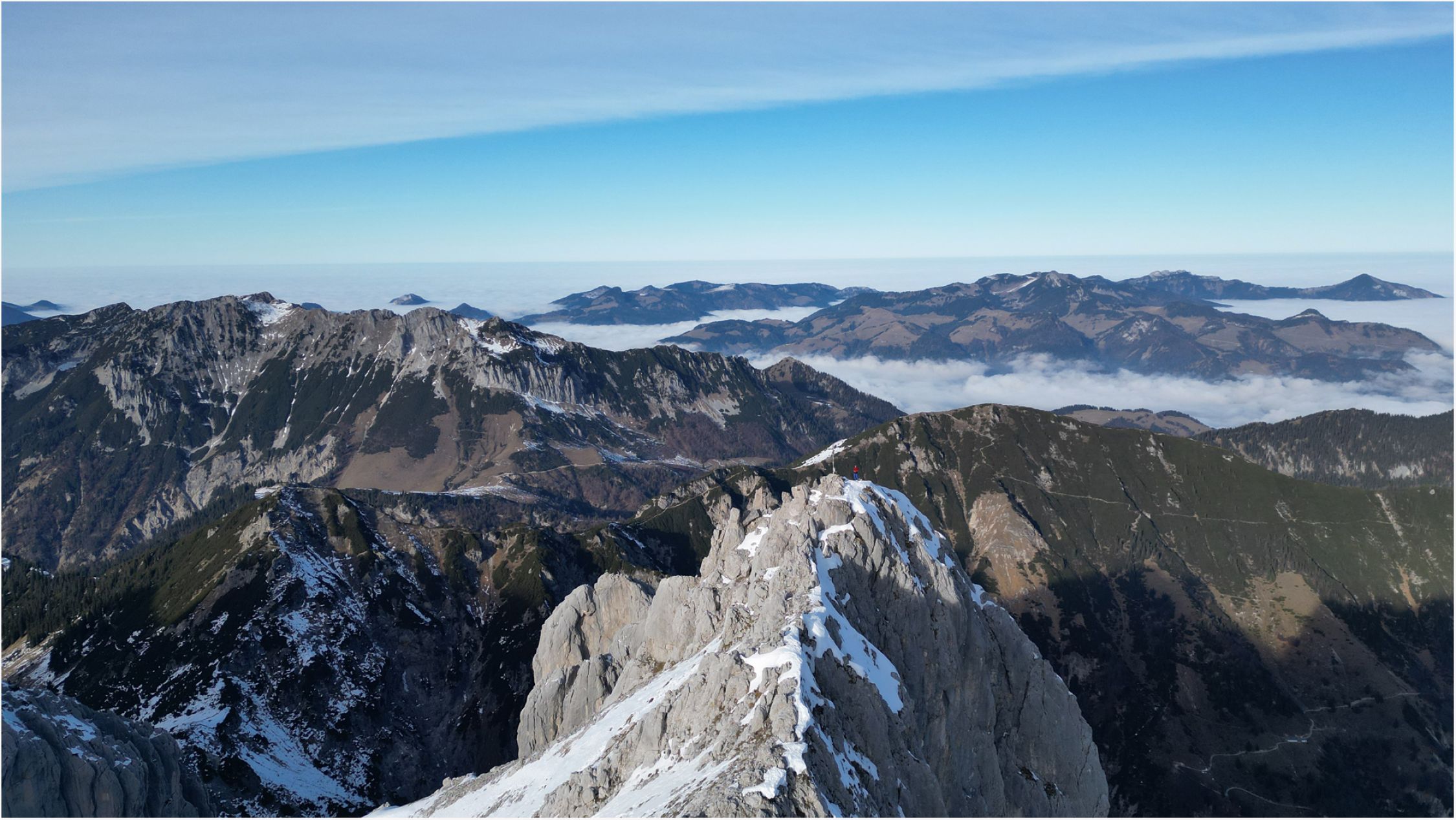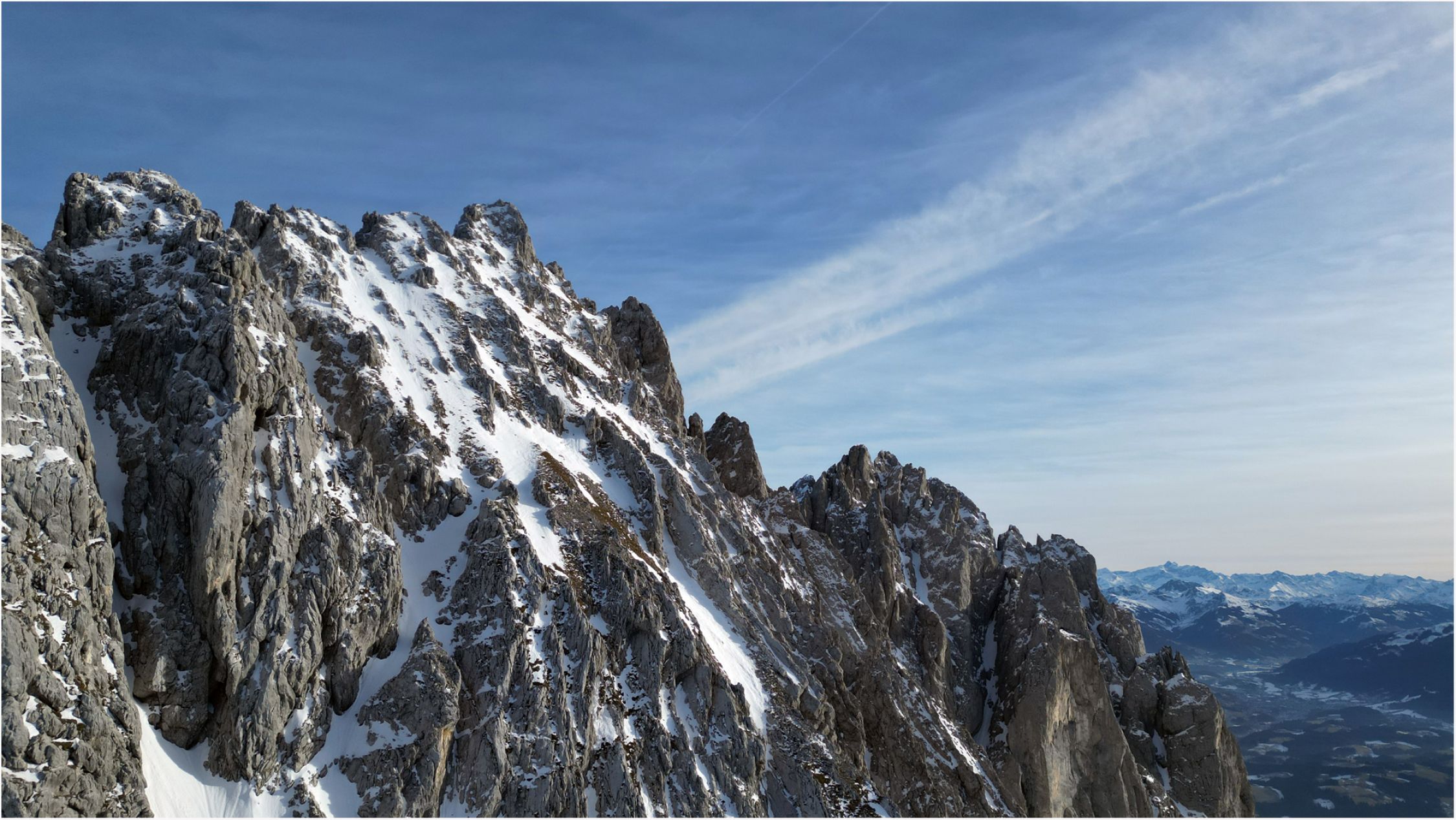 Blick in die Runde: Soweit das Auge reicht sehr wenig Schnee, deshalb bieten sich je nach Vereisung und Ausgesetztheit weitere Ziele zum Wandern an wie die gesamte Südseite des Zahmen Kaisers, etwa Rosskaiser, Feldberg. Pyramidenspitze von Süden.