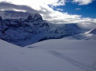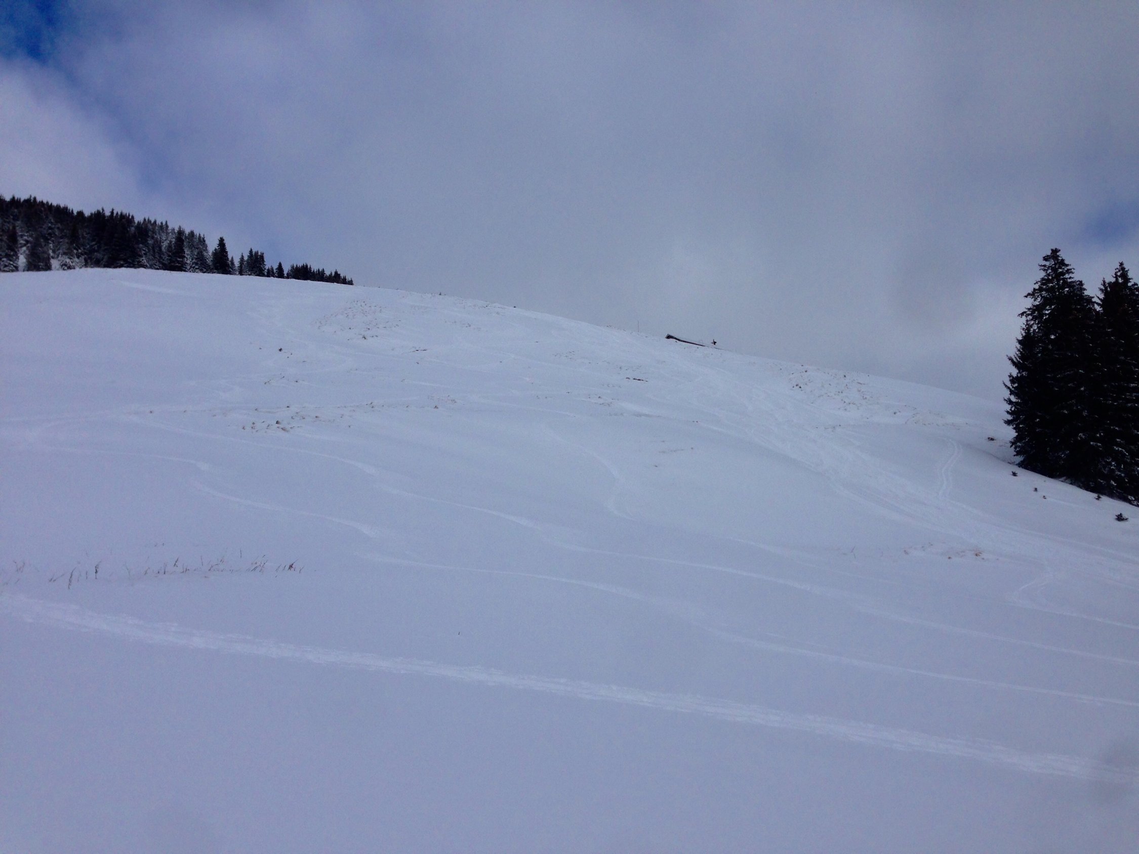 Unten ca 50-60cm Pulver, ohne Unterlage. Ab ca. 1800 abgeblasene Kanten und gut gefüllte Rinnen. Mit geschickter Routenwahl Pulver auf der ganzen Abfahrt.