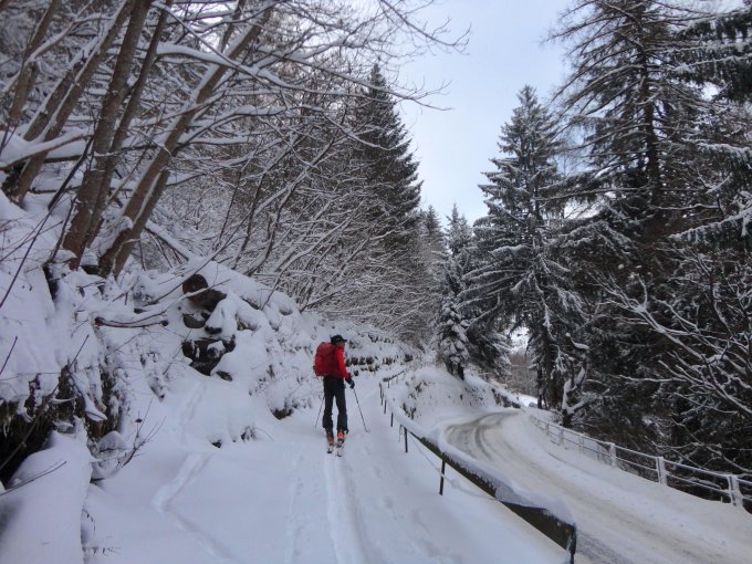 Weniger Neuschnee als erwartet, Schneelage dennoch gut. Im Bereich der Alpe Ebenwald etwas verblasen, hier Vorsicht auf Steine. Gipfelhang und Wiesenhänge sehr schön zu fahren, Waldgürtel oberhalb der Alpe unproblematisch mit ausreichend Schnee. Von der Alpe in´s Tal Abfahrt auf dem Forstweg.