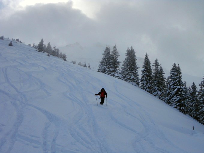 Pulver von oben bis unten. Da nicht so frequentiert, heute sogar noch unverspurtes Gelände gefunden. Wetter durchwachsen, Nebel und Wolken wechselnd mit sonnigen Abschnitten, tendenziell nachmittags besser. Am Gipfel etwas Wind und recht frostig.