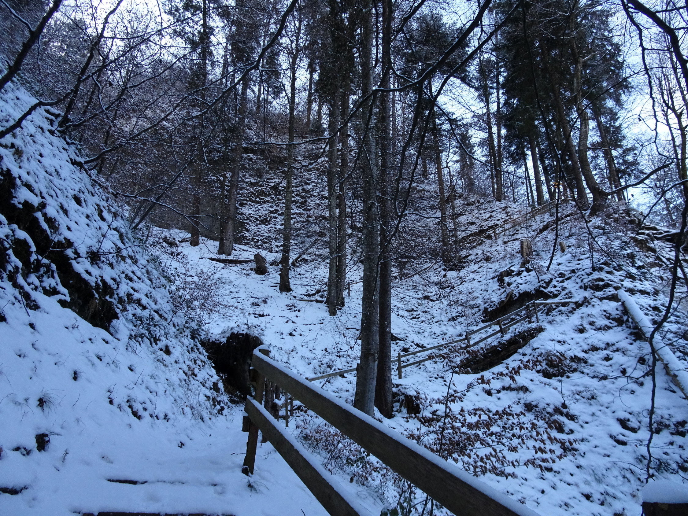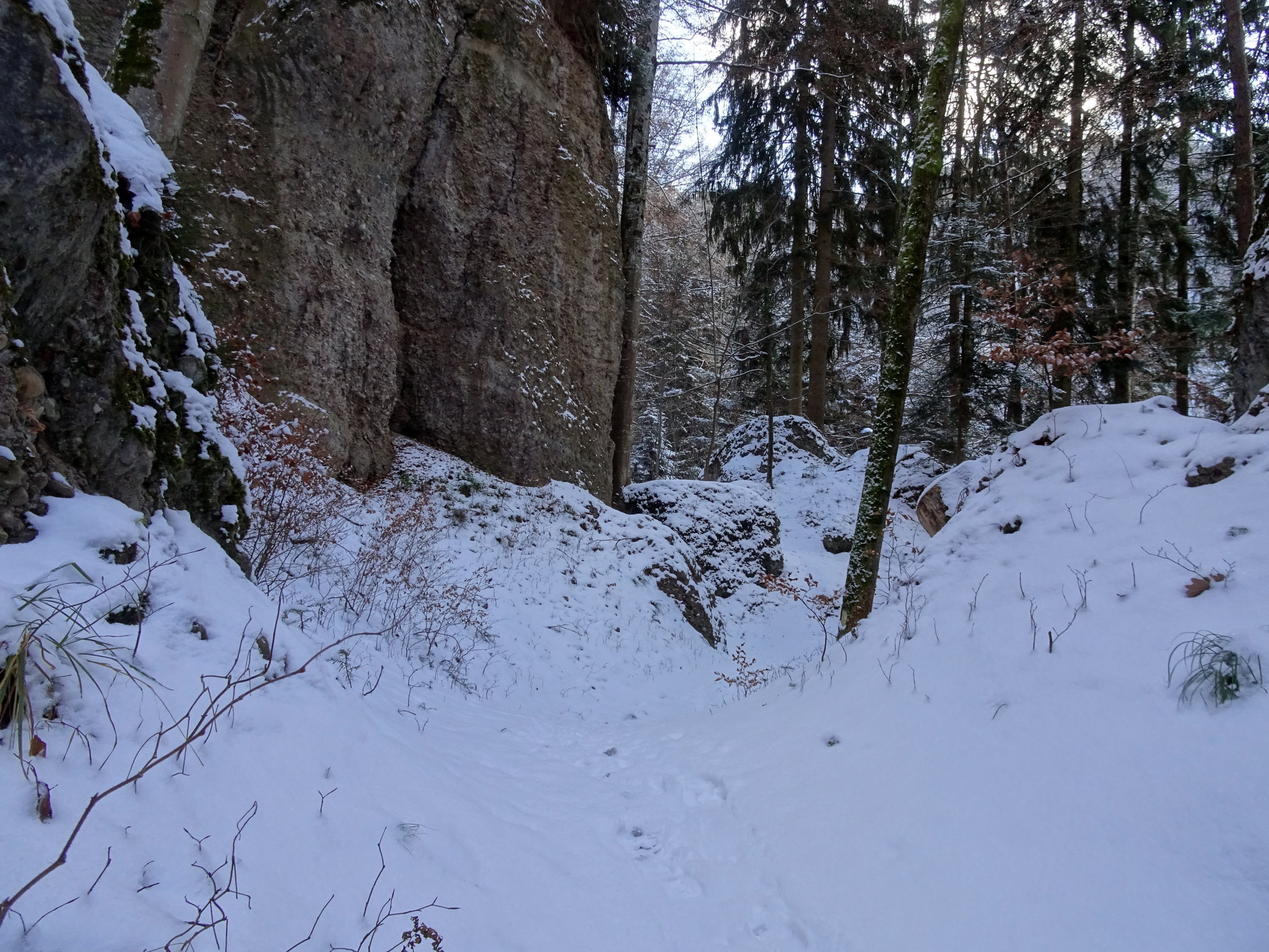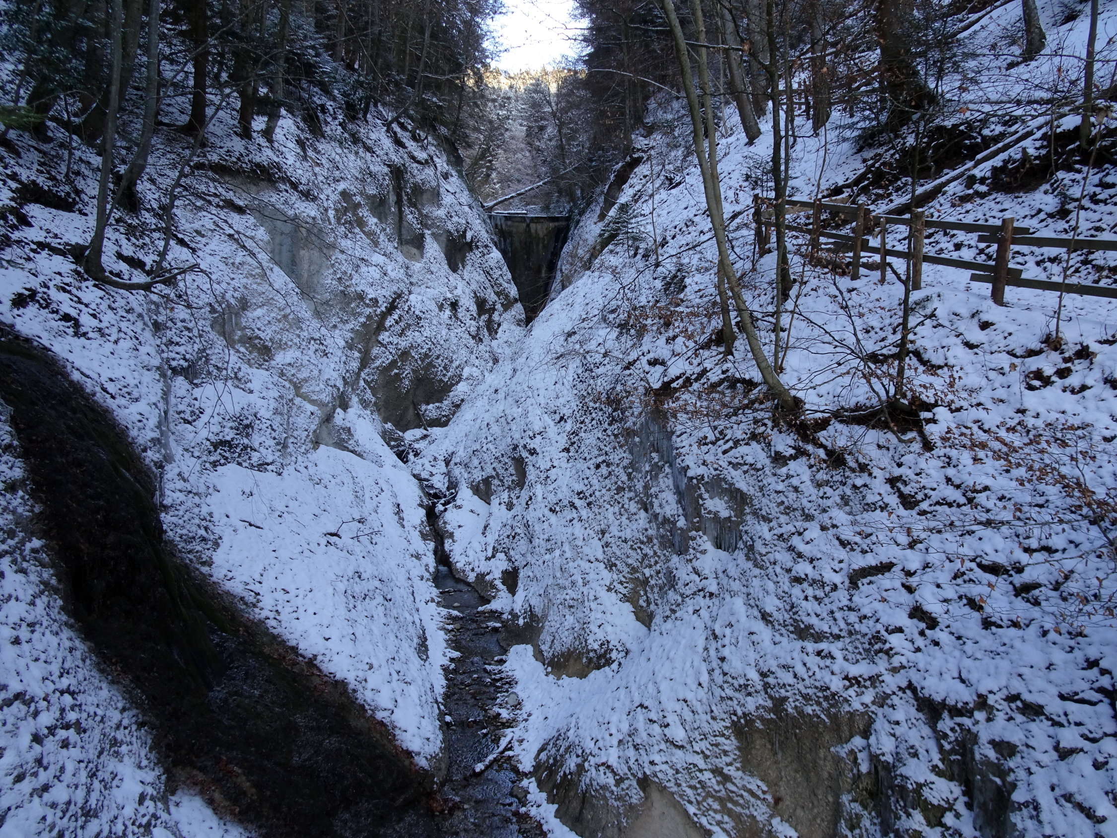 Die Riderbachschlucht kannte ich vom Sommer. Sie ist wild, interessant und der Weg ist gut angelegt. Im Frühling bei der Schneeschmelze oder im Sommer bei Gewittern ist eine Begehung riskant, weil man die enge Schlucht zweimal überqueren muss. Im Winter hat es schöne Eiszapfen. Ich wollte schauen wie es mit den Eiszapfen sei und fand...keine. Da dachte ich, wenn schon noch keine Eiszapfen da sind und das Wetter gut aussieht, da wandere ich soweit es ohne Schneeschuhe geht und es ging bis zur Blueme.