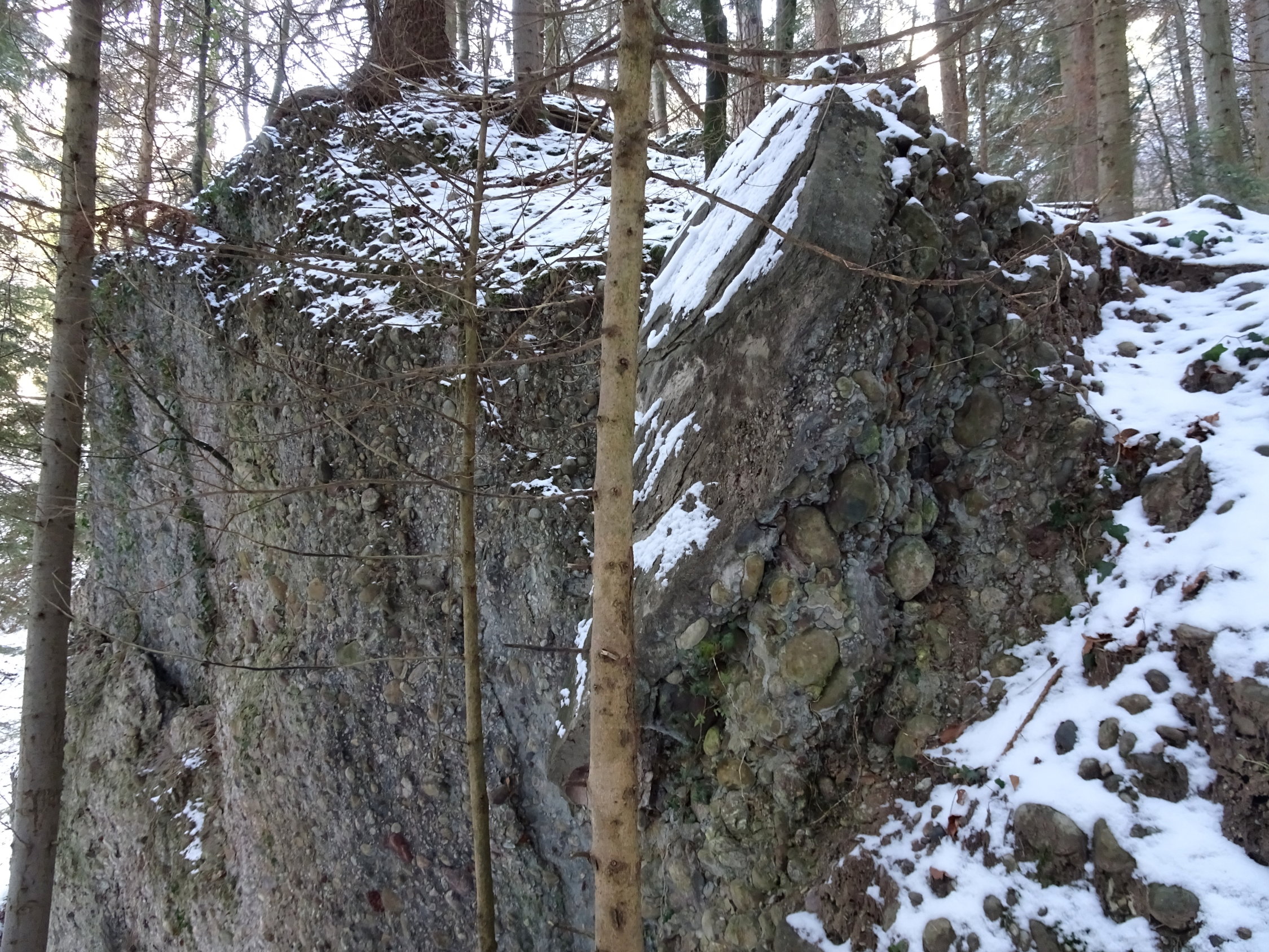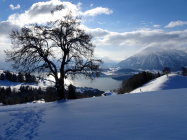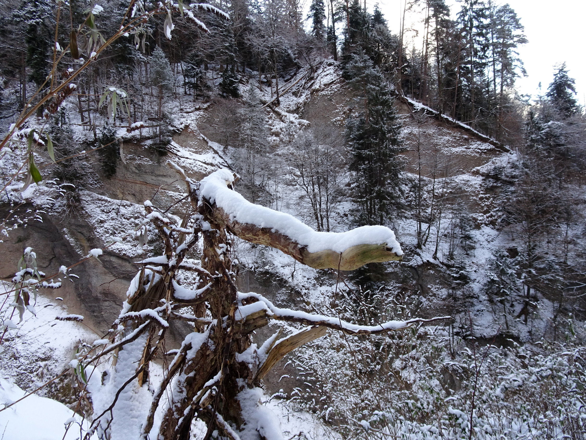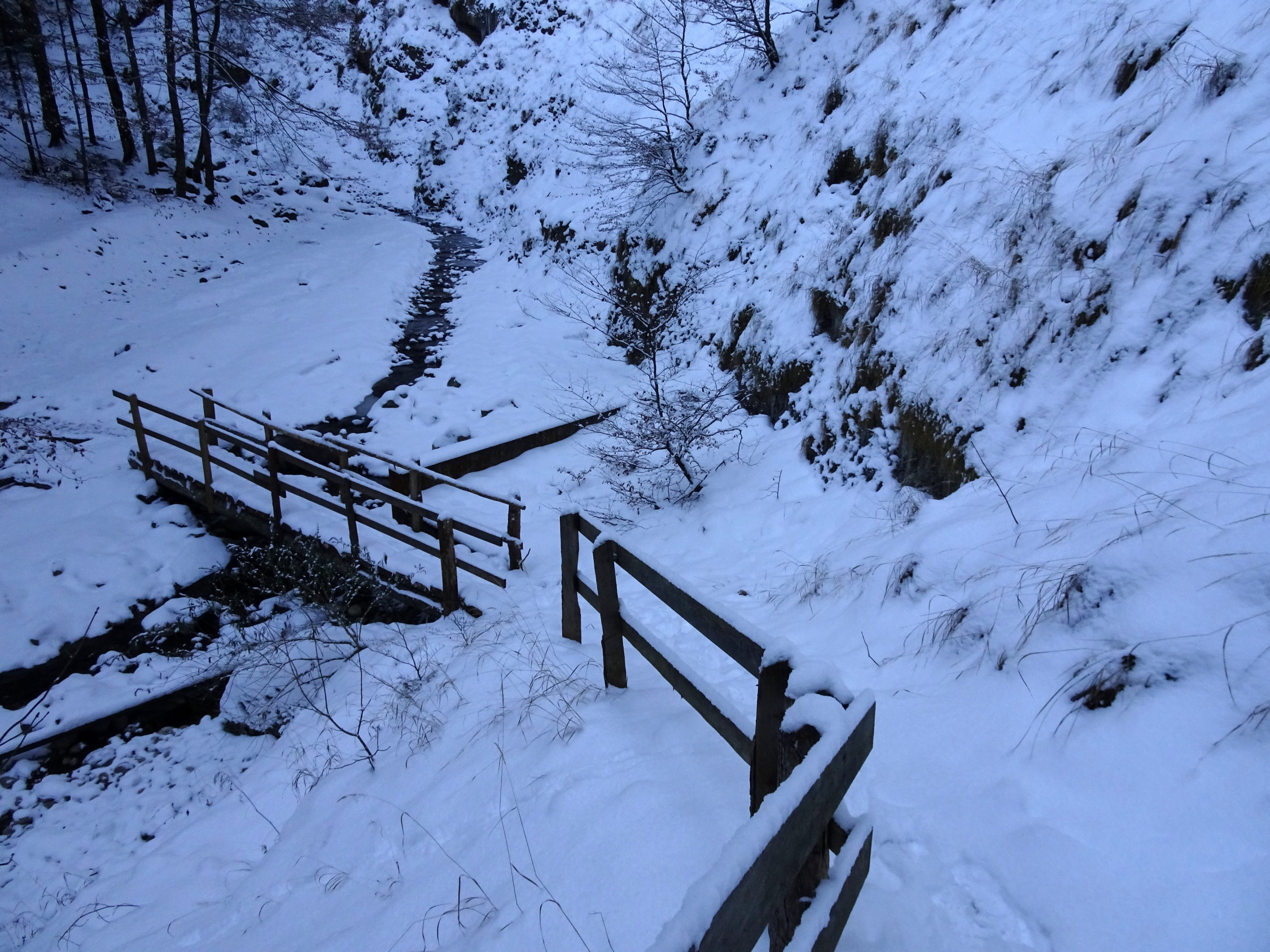Die Riderbachschlucht kannte ich vom Sommer. Sie ist wild, interessant und der Weg ist gut angelegt. Im Frühling bei der Schneeschmelze oder im Sommer bei Gewittern ist eine Begehung riskant, weil man die enge Schlucht zweimal überqueren muss. Im Winter hat es schöne Eiszapfen. Ich wollte schauen wie es mit den Eiszapfen sei und fand...keine. Da dachte ich, wenn schon noch keine Eiszapfen da sind und das Wetter gut aussieht, da wandere ich soweit es ohne Schneeschuhe geht und es ging bis zur Blueme.