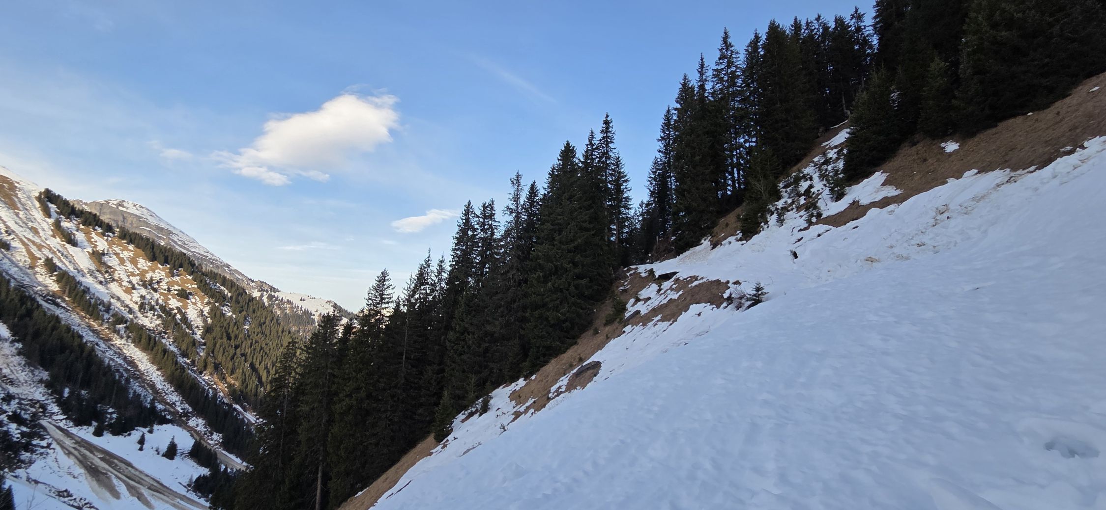 Eine kurze Tragstelle auf Fahrstrasse, ansonsten gäbig zu gehen ohne Harscheisen bis Skidepot. Mit Steiboard oder Bitcoin-Millionen im Sack geht auch mit Schi bis auf den Gipfel...