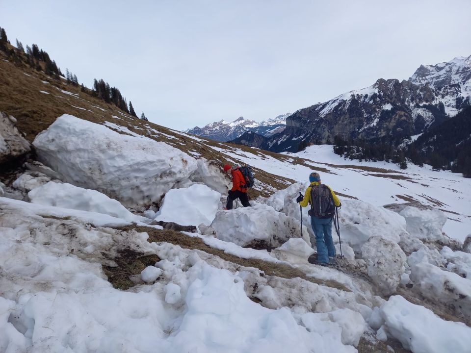 Schnee auf der Aufstiegsstrecke, bis zur Sulztaler Hütte, relativ wenig (im Wald zahlreiche apere Stellen und der Steilaufstieg unter dem Gipfel Gras).