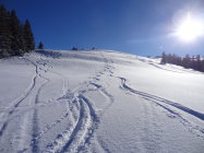 Entlang der Aufstiegsspur war es schon sehr verfahren. Wir sind daher bie Scharöösti rechts über den Rücken weitergefahren bis Stützli und erst dort die Hänge runter, die noch nicht oder kaum befahren waren (ein paar ältere Spuren vom Wochenende). Das hat sich gelohnt. Auf dem Rücken kurz Bruchharst (von der Bise freigeblasen), der Rest war gut.