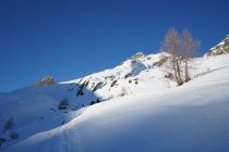Vom Mauerhorn dann die NW-Flanke runter (35-40°), dort hat es schönen Pulver! Auch im Tal zum Zem Tritt sehr schöner Pulver, inzwischen hat es ein paar Spuren drin. Ab Zem Tritt dann harter Schnee, eine sehr kurze etwas unangenehme Überquerung eines Lawinenkegels und der Querweg auf dem Wanderweg oberhalb von Eistli ist eine recht harte Bobbahn geworden. Auf der Strasse bis P. 1572 eine kleine Tragestelle und von dort mehr schlecht als recht über die Wiesen nach Ferden.