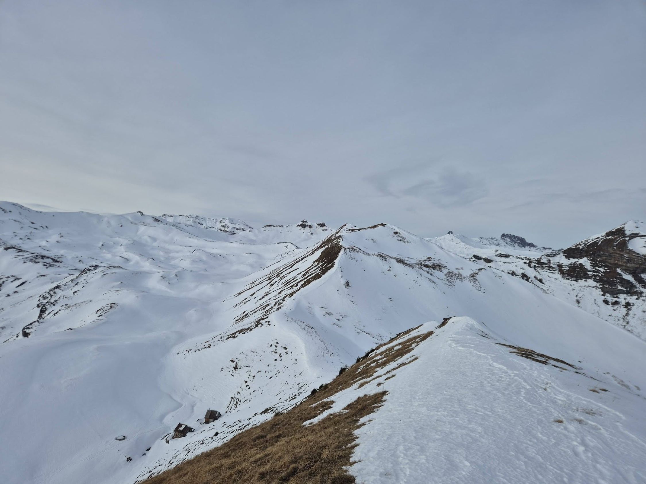 Mit dem Bike bis Mittelsäss, weiter über Gadims, Chläui, Guli, Walachamm, Langrain und Madchopf. Schnee hart, Guli Aufstieg besser ohne Schneeschuhe. Abstieg über Schönplanggen. Ab Vorsäss durchgehende Schneedecke. Für Schneeschuhe top, mit Ski machbar.