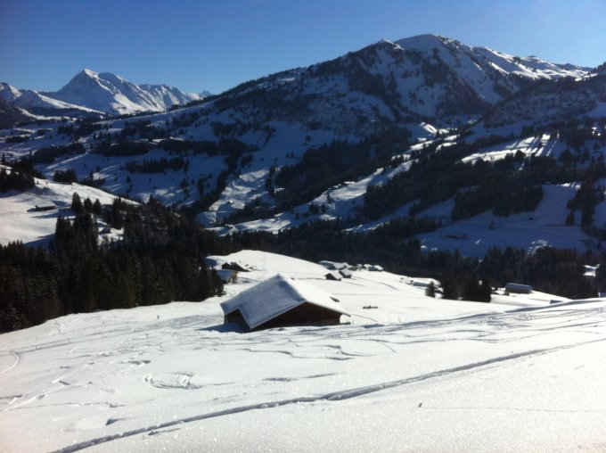 Vorwiegend Pulverschnee und ein bisschen Windharst. Unten hat die Sonne wohl Deckel für morgen vorbereitet.