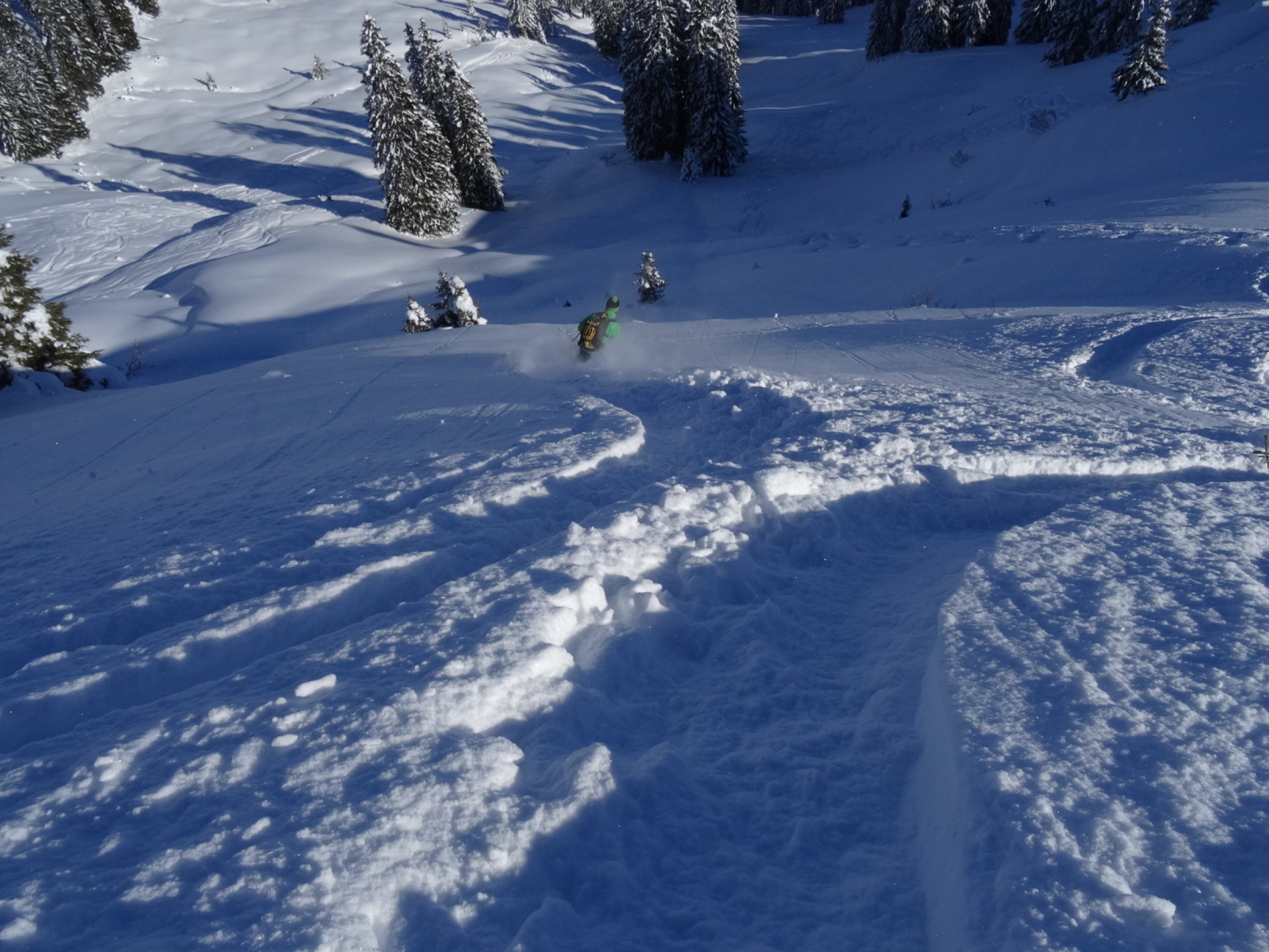 die eigentliche Abfahrt schon sehr zerfahren,aber durch den lockeren Schnee immer noch gut. Bei der Abfahrt ins Rettenschwangertal gibt es immernoch Platz