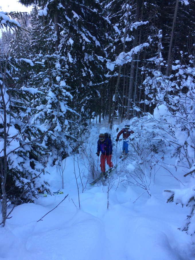 Abfahrt durch den herrlichen, leicht gesetzten Pulverschnee. Abfahrt durch das Wildgrimmi ist wie immer wie auf einem riesigen Spielplatz und bei etwas vorsichtiger Routenwahl ein absoluter Hit. Abfahrt unterhalb Pt. 1540 nur noch auf der Fahrstrasse empfehlenswert, im Wald hat es einfach noch zu wenig Schnee