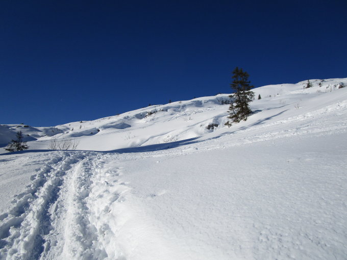 Von oben bis unten Pulverschnee, die grossen Löcher und Steine sind gut sichtbar.