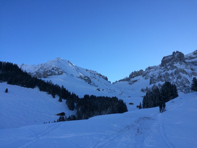 Unter der Alp Bunder schöne Pulververhältnisse in Schattenhängen oder gut zu fahrender angezogener Schnee, auch in den Waldpassagen gut fahrbar.