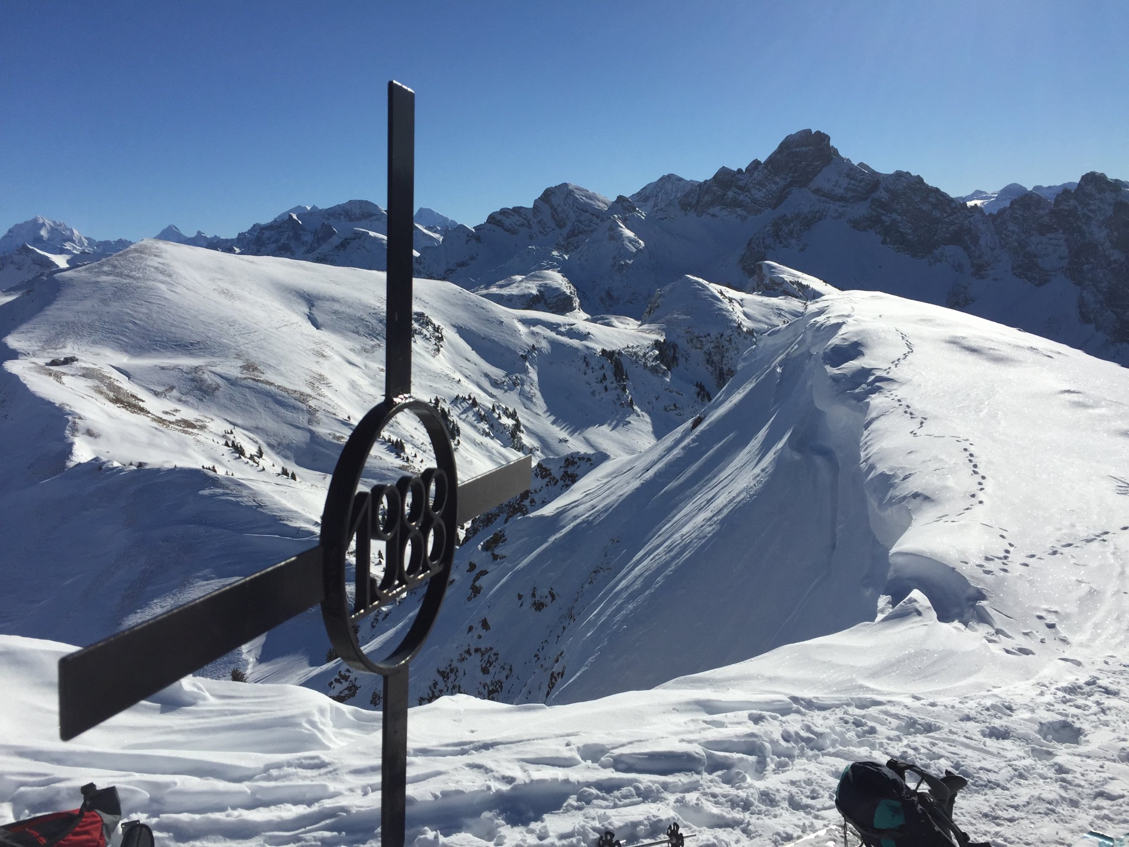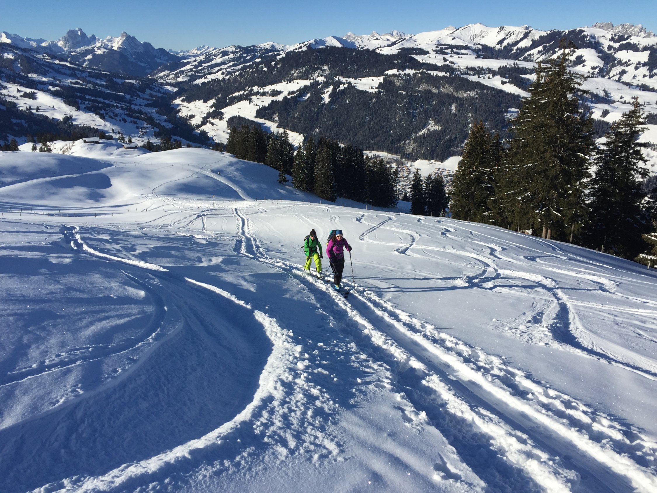 Kälte Minus 10 am Morgen in Zweisimmen. Der Aufstieg erfolgt bis zur Unteren Chumi im Schatten. Es hat gerade genug Schnee um bis nach Zweisimmen runter zu fahren. Nur in sonnigen Expositionen bildet sich langsam ein Deckel, sonst schönster Pulver. Der Gipfelhang ist etwas verblasen. Zum Teil kommen die Grasbüschel hervor. Trotzdem eine sehr lohnende Tour. Heute bei bestem Wetter mit super Fernsicht. Darum auch viele Leute unterwegs.