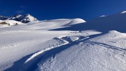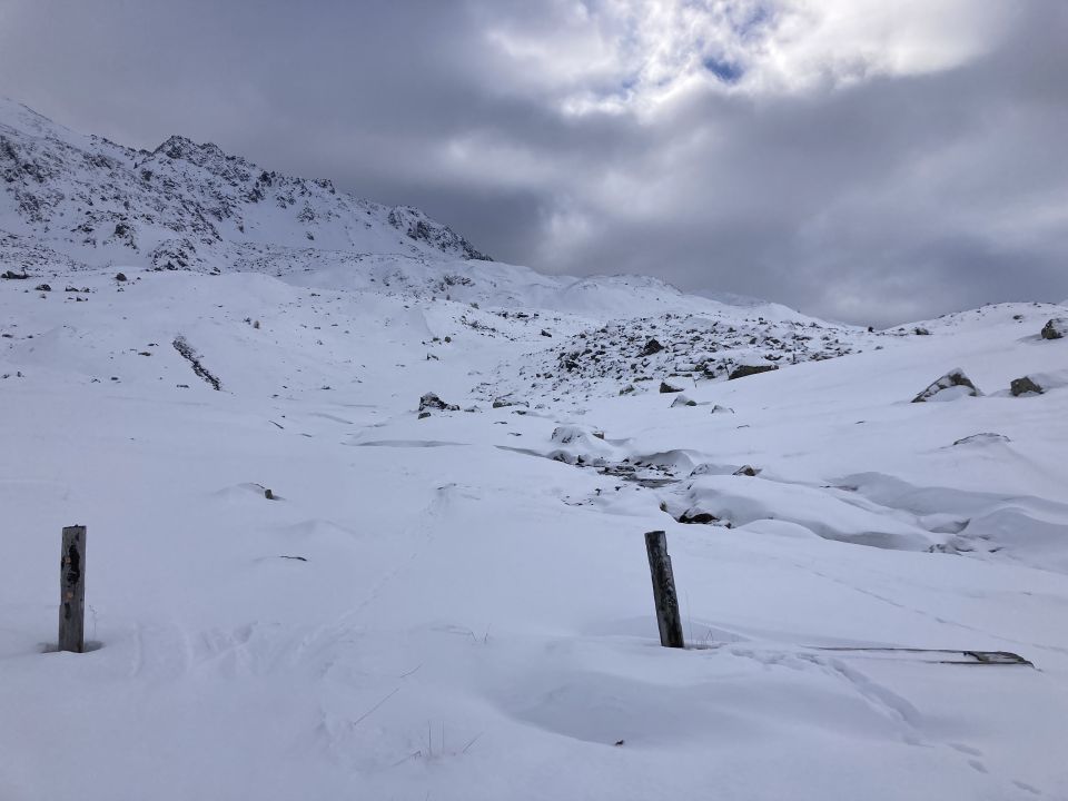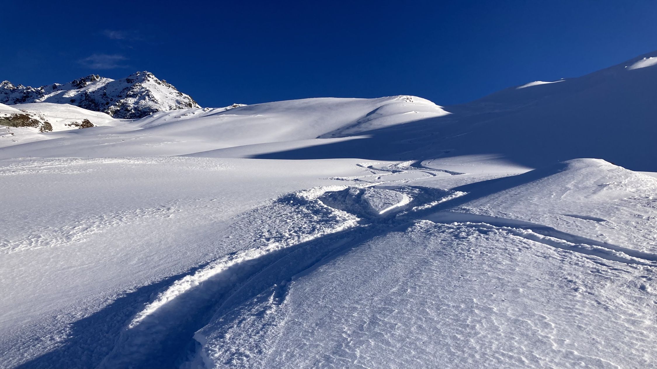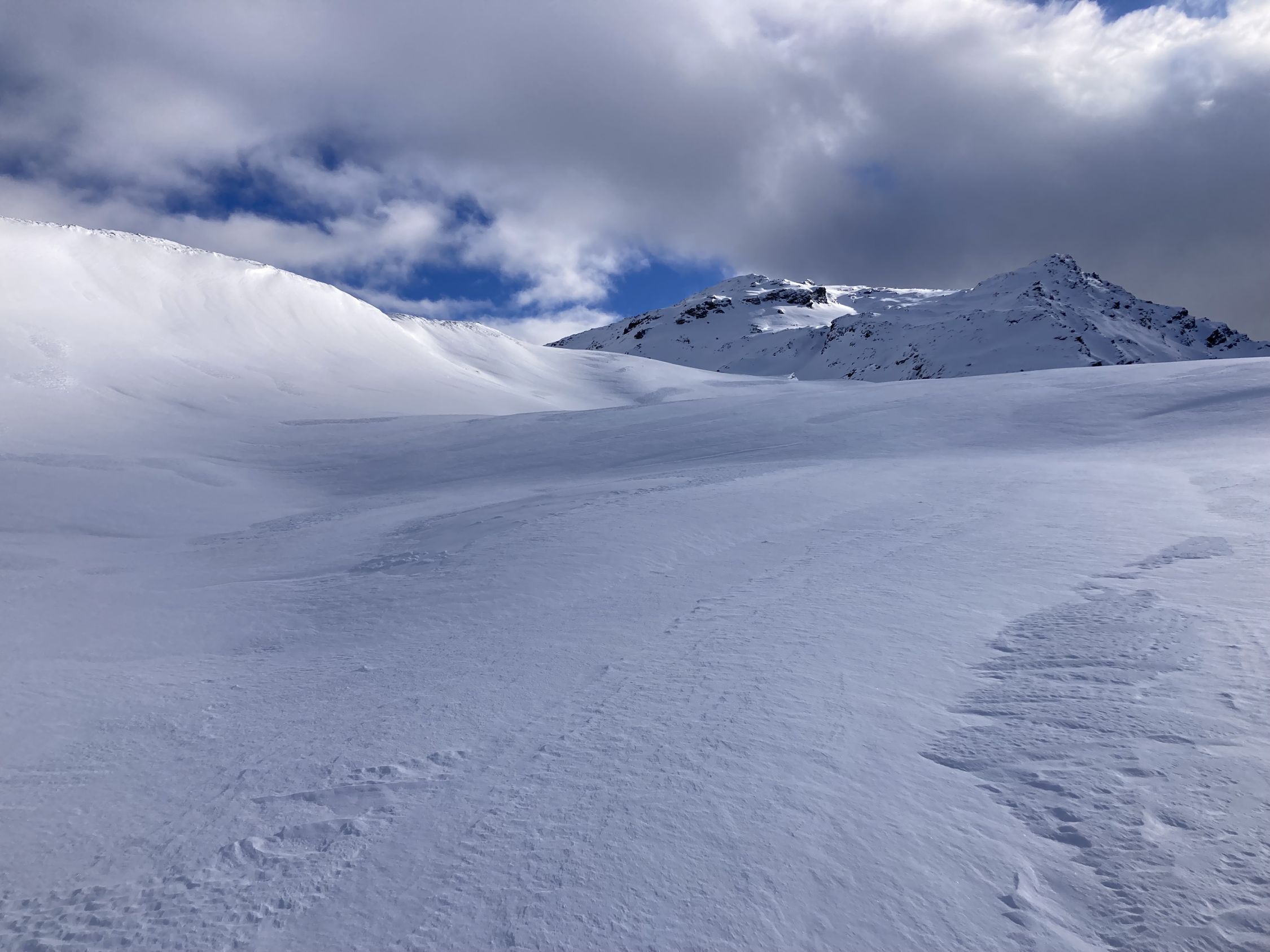 Von der Alp Tgavtetga Richtung Lunghinpass in den windgeschützten Bereichen schöne Schneeverhältnisse. Heute windstill auf dem Gipfel. Motta da Sett wurde ebenfalls frisch einspurt.