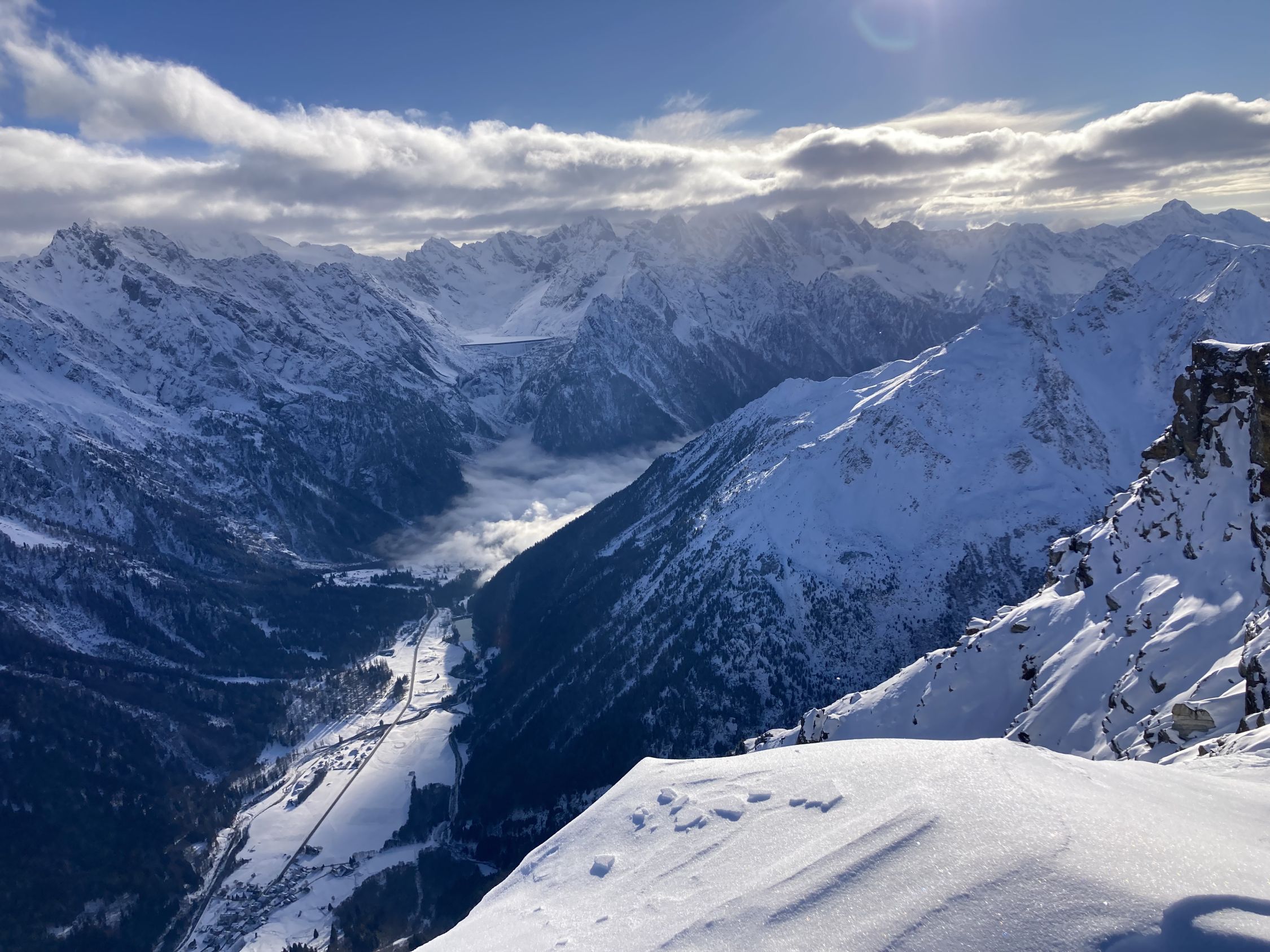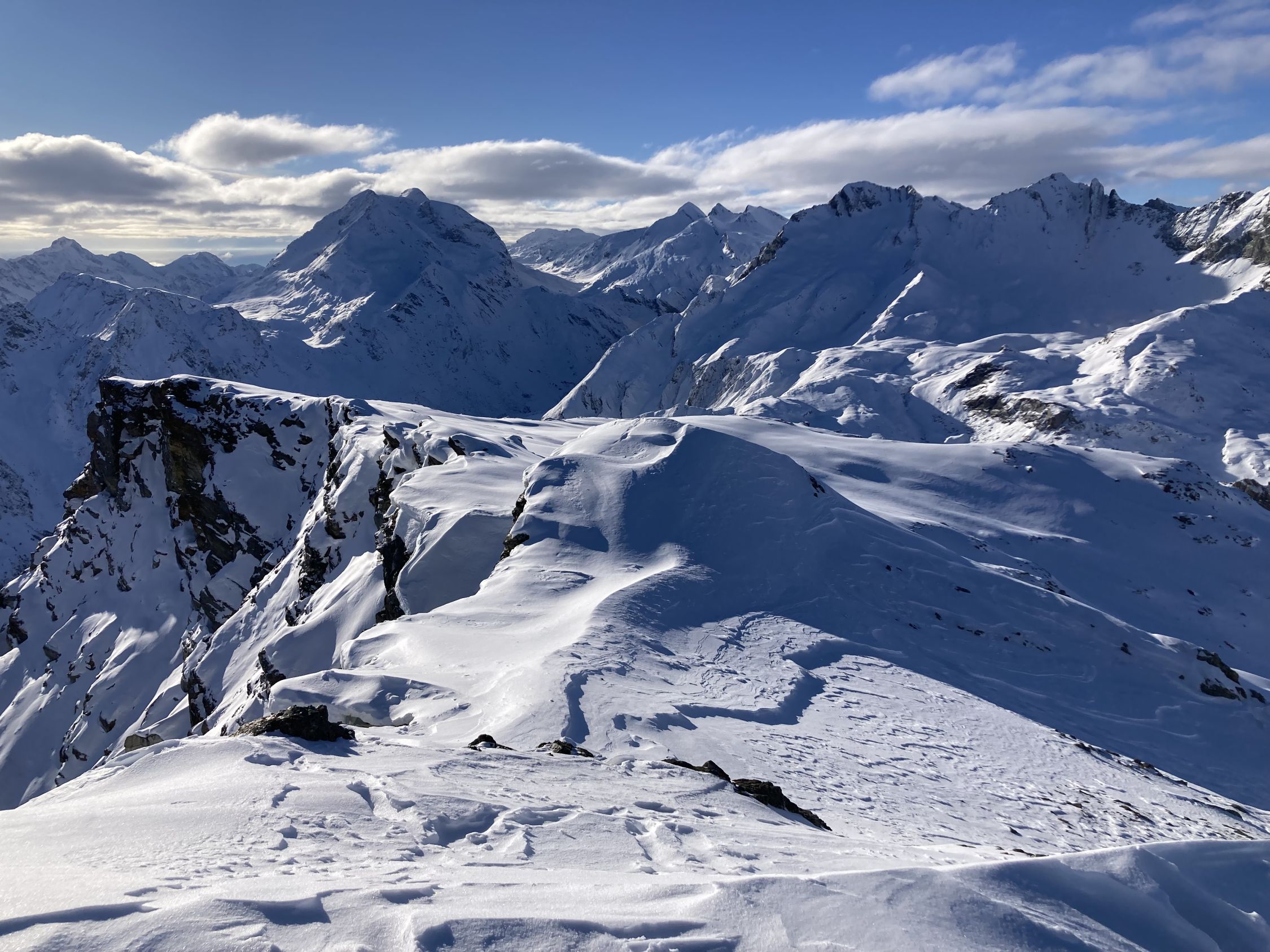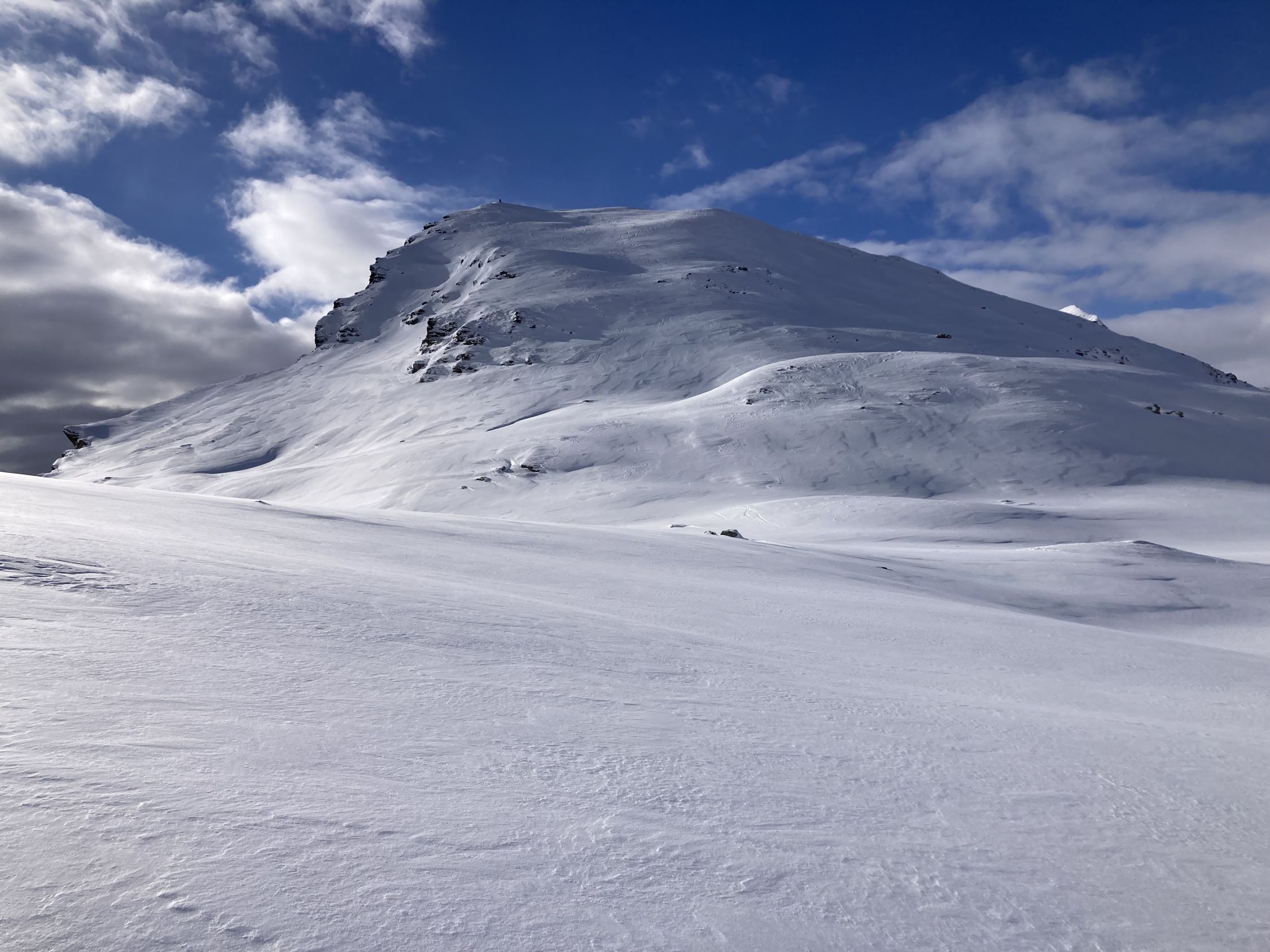 Von der Alp Tgavtetga Richtung Lunghinpass in den windgeschützten Bereichen schöne Schneeverhältnisse. Heute windstill auf dem Gipfel. Motta da Sett wurde ebenfalls frisch einspurt.