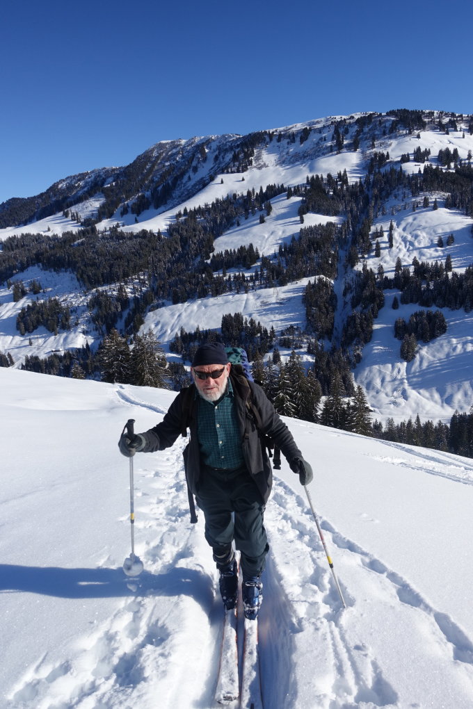 sind am Morgen nach Uebernachtung in Grubenberghütte SAC auf Husegg hoch und zum Zmorge über die Nordflanke runter über untere Bire nach Abläntschen.Schöner Pulfer oben,Zwischenstück kurz deckelig und unten raus wieder Pulfer.